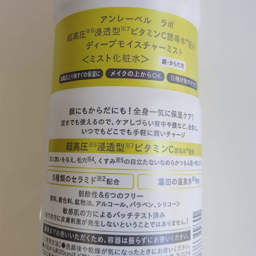 アンレーベルV ディープモイスチャーミスト✨顔・全身に使えるミスト化粧水で、シュッとひと吹きでうるおい広がる!微細なミストがお肌をやさしく包み込み、しっかり水分チャージ✨ベタつかずさらっとお肌になじむ☺️逆さでも使えるスプレーなので、背中や腰...