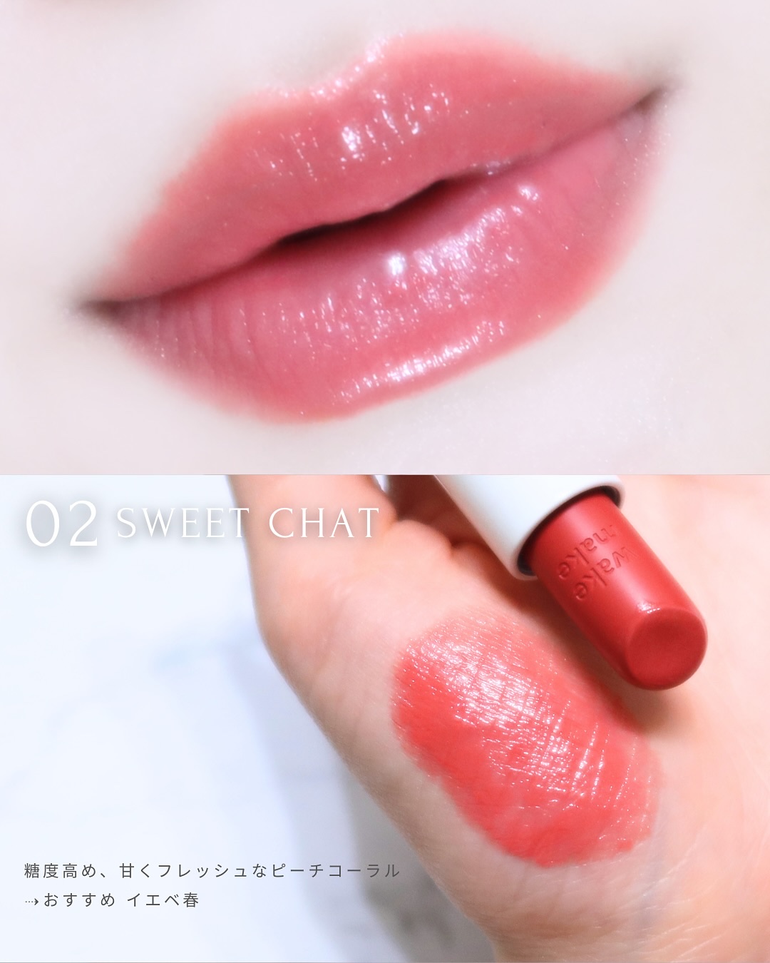 唇にしっかり定着してくれて、ほんと落ちにくい!!😳👏 食事をしても唇に血色感が残るので デートにもおすすめ🥰 しかも全色絶妙にかわいいカラー、、🤤❤️🔥 ブルベ夏のわたしは特に03,04がお気に入り!