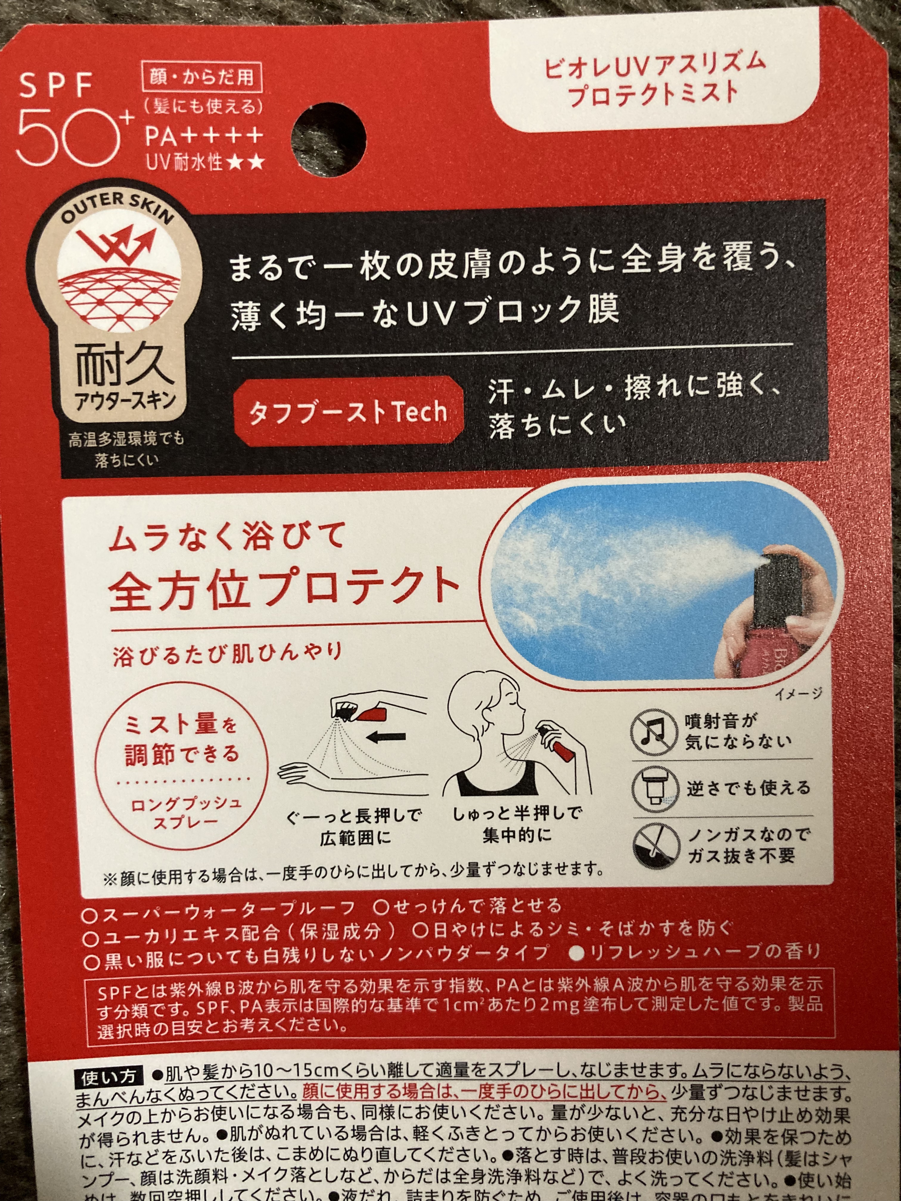 - 過酷な環境*2にも耐える 最高クラス*1UV ムラなく浴びる全方位密着ミスト ● 汗・ムレ・擦れに強く落ちにくい、タフブーストTech採用 ● SPF50+ PA++++ UV耐水性★★ ● 日やけによるシミ・そばかすを防ぐ ● スーパーウォータープルーフ ● せっけんで落とせる ● ユーカリエキス配合(保湿成分) ● 黒い服についても白残りしないノンパウダータイプ ● リフレッシュハーブの香り ● 噴射音が気にならない ● 逆さでも使える ● ノンガスなのでガス抜き不要 *1 ビオレUVシリーズ内におけるUVカット効果(SPF50+ PA++++)および、高温多湿環境での塗膜の落ちにくさ *2 高温多湿環境(40℃、湿度75%)