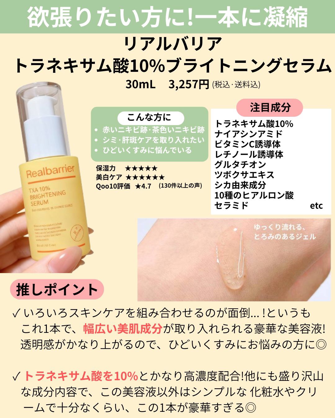 | スキンケアランキング第55位 | クリームよりこってりしてなくて、 どちらかというとすーっと伸びの良い エッセンスのようなテクスチャーでした◎ | 詳細を見る | |