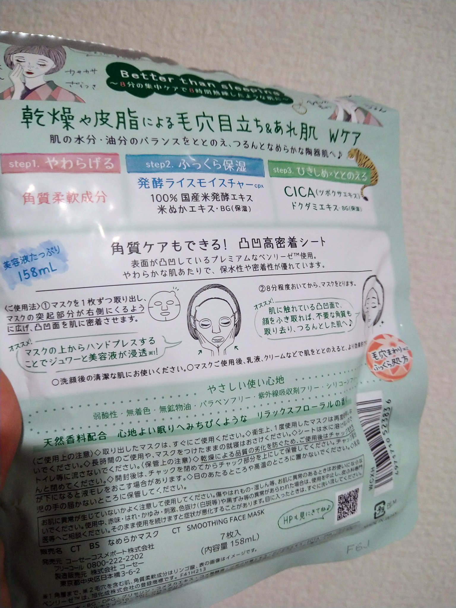 - 毛穴・肌あれが同時にケアできる、毛穴小町マスク! ①毛穴目立ち&肌あれをダブルでケア!なめらか陶器肌へ 水分・油分をバランスよく配合したみずみずしい美容液で、乾燥や皮脂による毛穴目立ちやあれ肌もケアします。キメのととのった、つるんとなめらかな陶器肌に導きます。 角質柔軟成分※3配合。肌をやわらげます。 100%国産米発酵エキス・米ぬかエキス・BG(保湿)をはじめとする発酵ライスモイスチャーCPX配合。ふっくらと保湿します。 ツボクサエキス・ドクダミエキス・BG(保湿)配合。ツボクサエキスは今話題のCICA成分です。肌をひきしめととのえます。 ※3 角質柔軟成分はリンゴ酸 ②角質ケアできる凸凹高密着シート コットン生まれでやわらかな肌触りの国産シートを採用。シートマスクの表面には凸凹のエンボス加工を施しているため、密着性が高く、はがしたマスクでやさしく顔をふきとることで角質ケアもできます。 ③心地よい眠りにみちびくようなリラックスフローラルの香り(天然香料配合) ④やさしい使い心地 弱酸性・無着色・無鉱物油・パラベンフリー・紫外線吸収剤フリー・シリコーンフリーのやさしい使い心地です。
