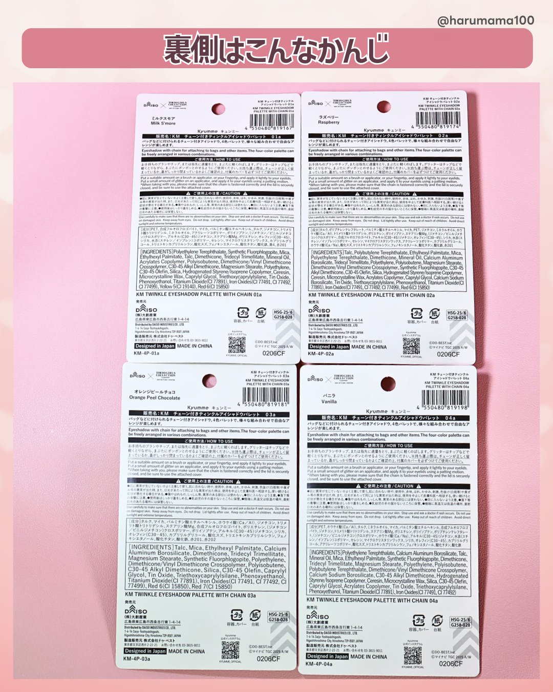 Kyummeチェーン付きティンクルアイシャドウパレット☑︎220円☑︎全4種☑︎ボールチェーン、カバー付き⭐️スウォッチまとめ⭐️01aミルクスモア02aラズベリー03aオレンジピールチョコ04aバニラ全体的に美味しそうな名前なバッグに付けれ...