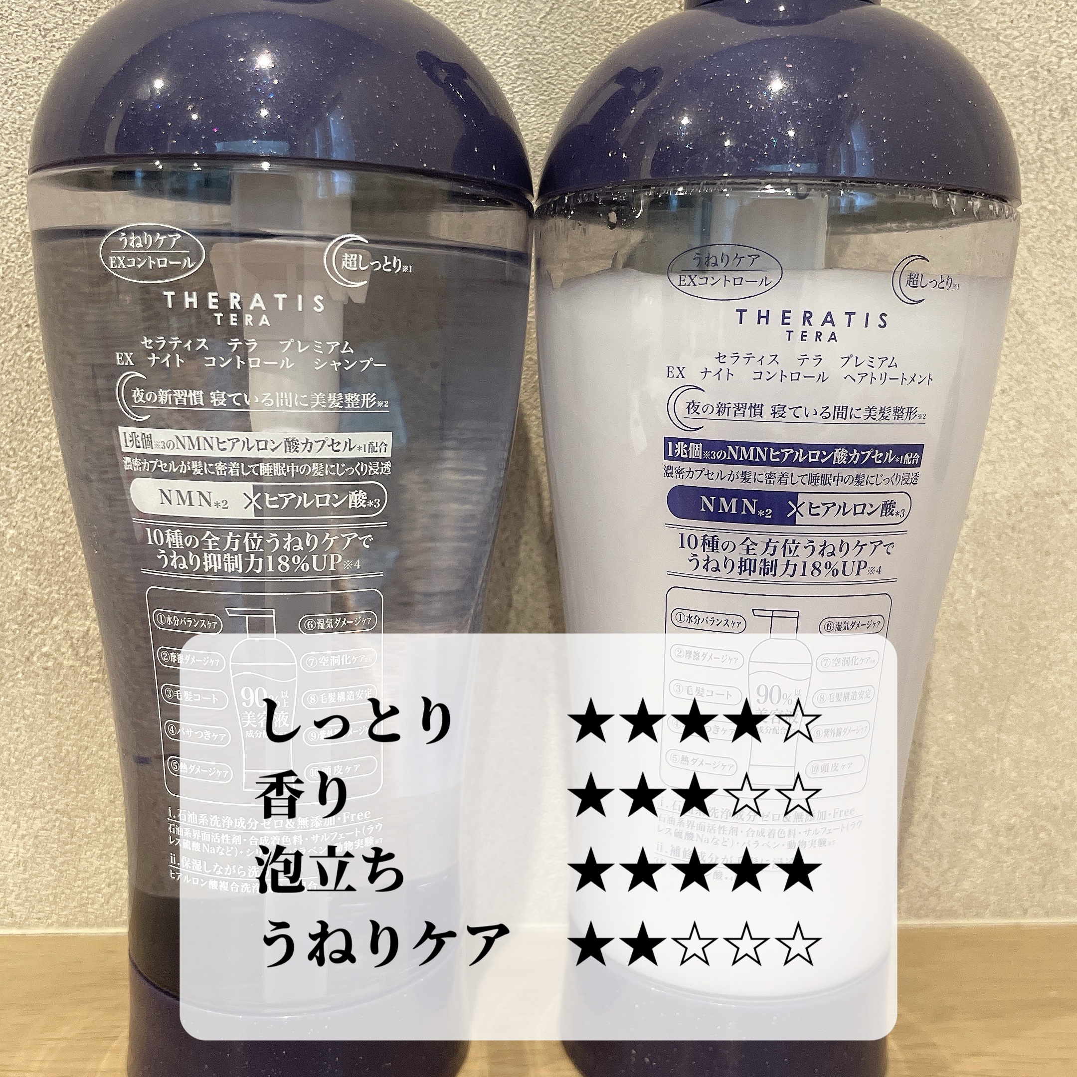 - 寝ている間に1兆個*1のNMNヒアルロン酸*2や10種のうねりケア成分*3がしみ込み、乾燥からくるうねりによる髪悩みへ全方位的にアプローチ。 さらに、製品の90%以上を美容液成分*4で構成し、贅沢な成分とナイトコントロール処方で、ワンランク上の超しっとり髪*5へ導きます。 石油系洗浄成分・合成着色料・ラウレス硫酸Na・パラベン・動物実験*6フリー処方。 シャンプー:ジャスミンティーアロマの香り ヘアトリートメント:ラベンダーティーアロマの香り *1 製品に配合しているリポソーム成分(*1)の数量(シャンプー、ヘアトリートメント、ヘアマスク、ヘアミルクに配合) *2 ニコチンアミドモノヌクレオチド(保湿)と加水分解ヒアルロン酸(保湿)をリポソーム化したもの *3 セラミドAP、グルコノラクトン、ポリクオタニウムー51、ソルビトール、γードコサラクトン、加水分解水添デンプン、加水分解エンドウタンパク、スフィンゴ糖脂質、ビフィズス菌培養溶解質、ブッチャーブルーム根エキス(全て保湿) *4 基剤を除く、水を含む *5 当社既存品内(THERATISシリーズ内) *6 製品として