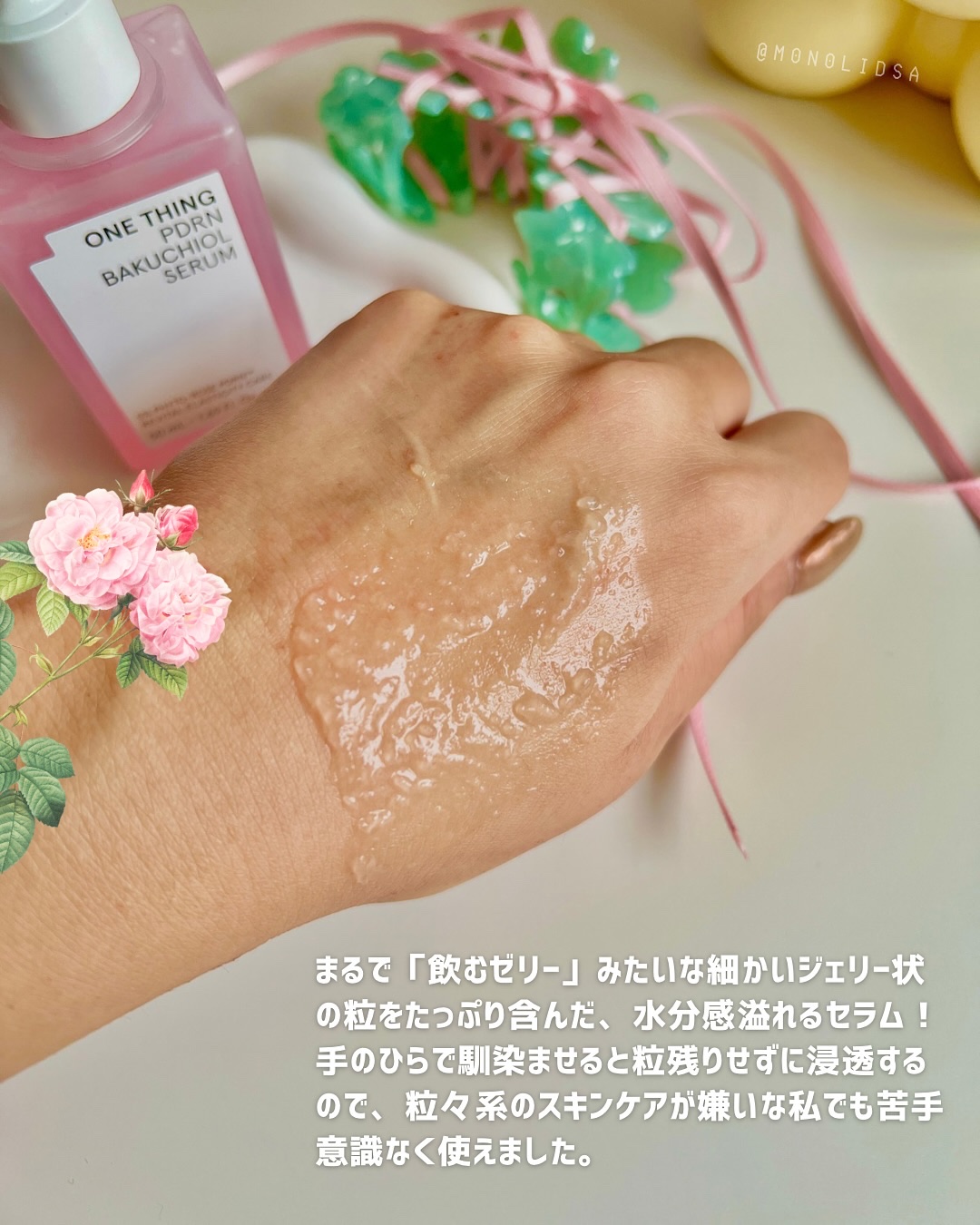 【ONETHINGPDRNバクチオールセラム】軽めのジェル状セラムで、ベタつかずに肌にスッと馴染むささやかにローズの香りがするかな?🌹トーンアップや、小ジワに効きそう◎❤PDRN皮膚再生効果が期待される成分で、サーモンDNA由来肌の弾力、修復...