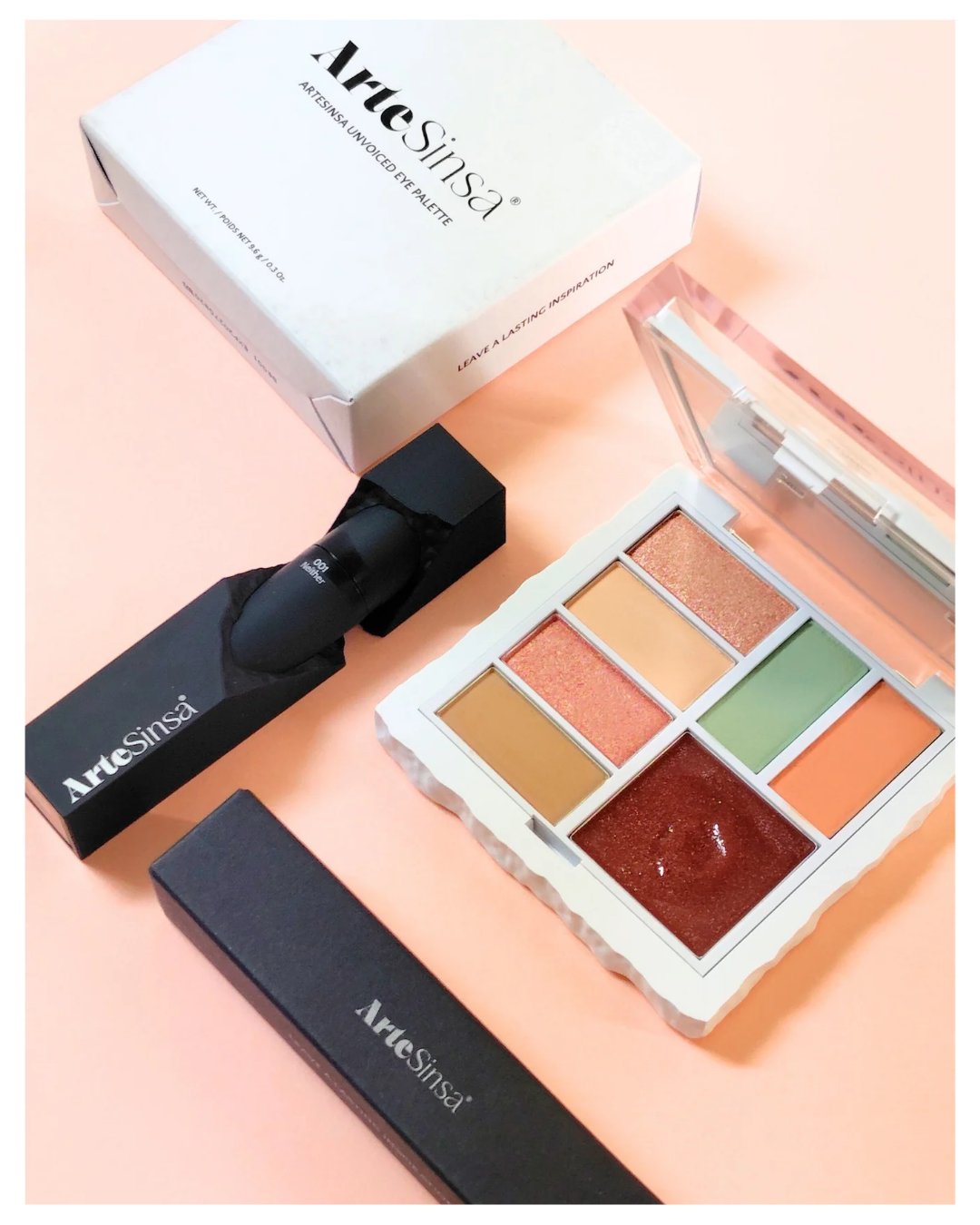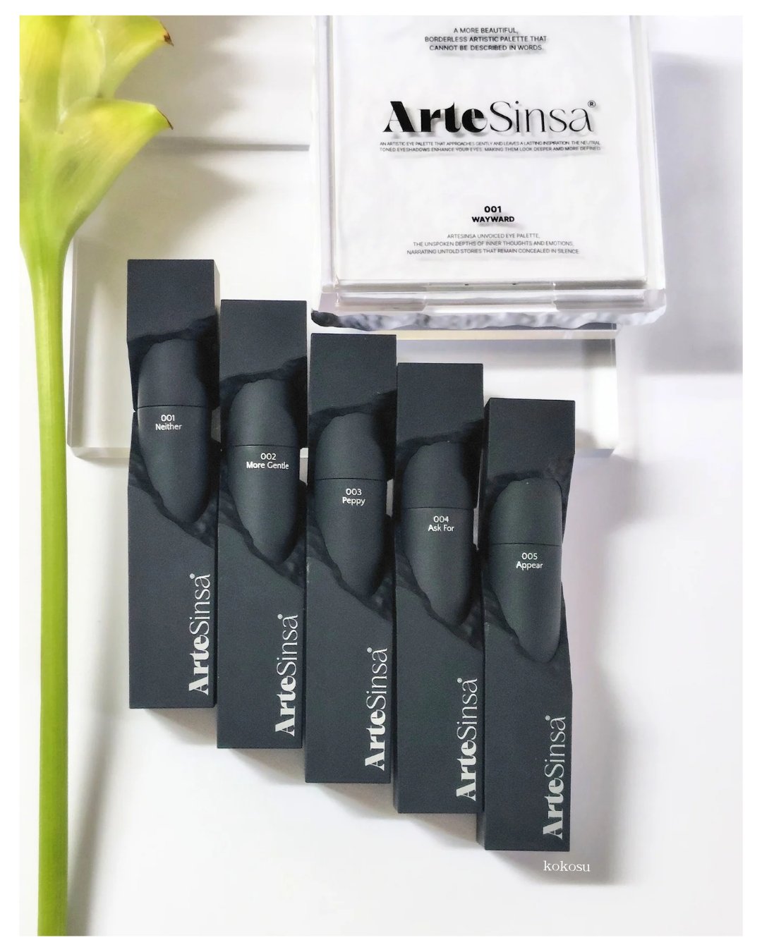 ArteSinsa▶SilkyBlurTint彫刻パケがおしゃれな、なめらかスムースな塗り心地のマットティント🖤乾燥を感じにくくピタっと密着して発色してくれる感じ🎶チークにも使えてじゅわっと発色が可愛いです🥰▶アンボイスドアイパレット/001...