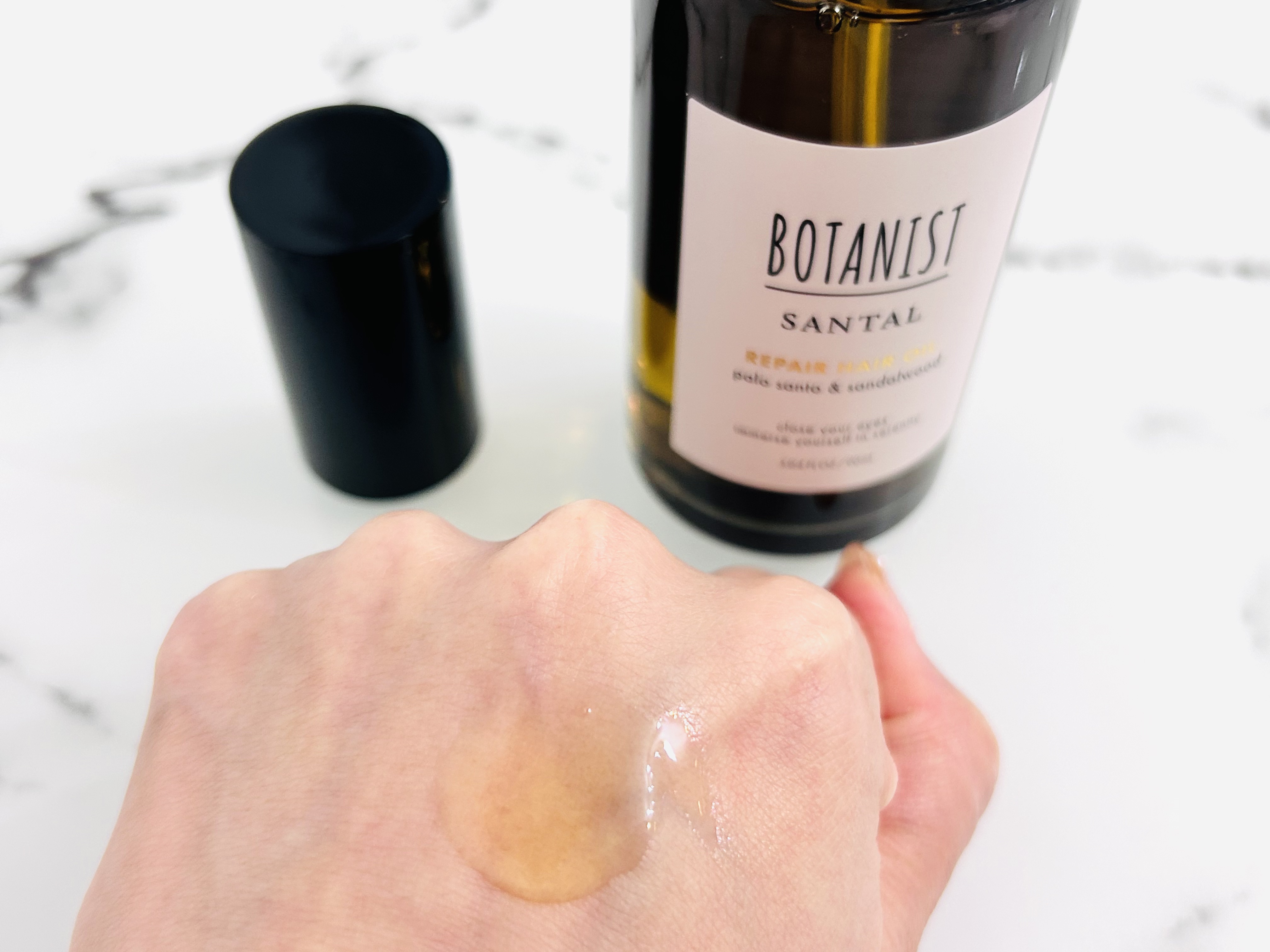 『ボタニストサンタルリペアヘアオイル』濃香オイル配合で、髪のパサつきやツヤ不足、カラー・摩擦・熱などによるダメージ髪の絡まりやきしみ髪を濃密補修します。実際に使ってみました!パッケージは高級感があり、容器はポンプ式なので使いやすいです。とろみ...