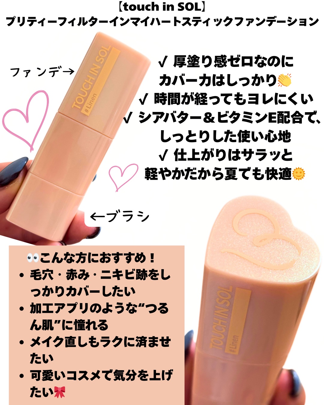 \ハートスティックファンデ/touchinSOLスティックファンデーションなめらかな塗り心地でピタッと密着!肌悩みを程よくカバーしてしっとりツヤ肌仕上げ🫧付属のブラシで馴染ませると薄膜で綺麗な仕上がり🫧ブラシ一体型なのも便利でスティックタイプ...