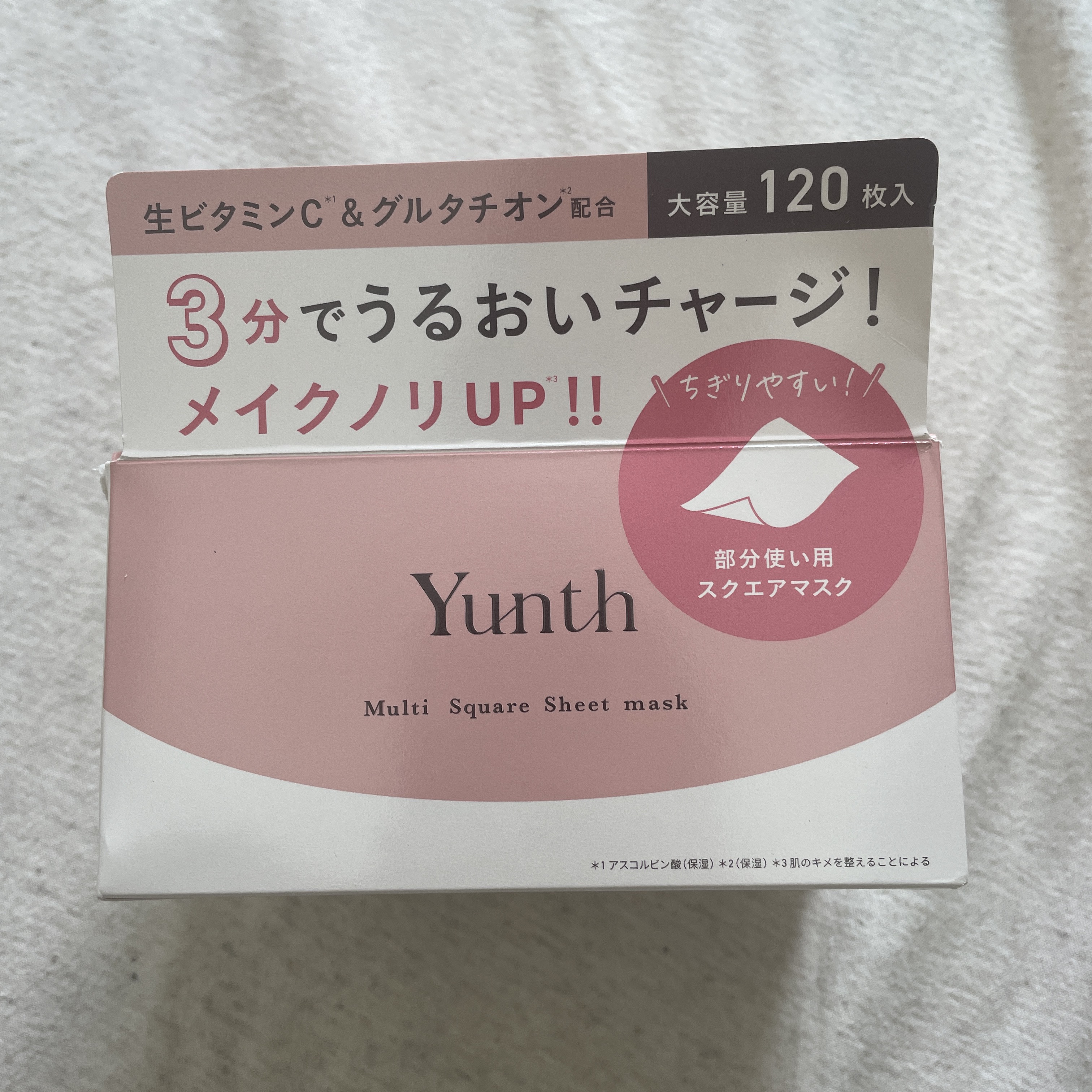 - ① 生ビタミンC×グルタチオンで、輝きあふれる透明感へ。与える+オフのWアプローチ Yunthでおなじみの生ビタミンC※1に加え、グルタチオン※2やセラミド※3、ヒアルロン酸※4など肌の保湿と透明感※5を底上げする成分だけでなく、ふき取り用途として次世代型AHA※6、肌を整えるアゼライン酸※7やツボクサエキス※8も配合。あらゆる肌悩みに多角的にアプローチする処方設計です。 ※1 アスコルビン酸 ※2 グルタチオン (保湿) ※3 セラミドNP、セラミドNG、セラミドAP (保湿) ※4 ヒアルロン酸Na (保湿) ※5 うるおいによる ※6 グルコノバクター/ハチミツ発酵液 (整肌) ※7 アゼロイルジグリシンK (整肌) ※8 ツボクサ葉/茎エキス (整肌) ②たっぷり使える120枚入り。毎日使いやすい“ちぎれる”スクエア形状 液含みがよく、手で簡単にちぎれるシートを採用。 顔全体はもちろん、小鼻・目元・首元など気になるパーツにサッと貼ることができます。お好みのサイズにちぎって、Tゾーンや目元などのピンポイントケアにも最適です。たっぷり使える大容量120枚入り。 ③高密着&高保のシートで忙しい朝でも3分で潤いチャージ 絶妙な厚みの高密着シートが肌にぴたりとフィットし、美容液のうるおいをしっかり届けます。たった3分で肌をみずみずしく整え、メイクのノリもアップ。夏のメイク崩れも防ぎやすくします。「毎日のスキンケアをもっと手軽に」「隙間時間に賢くケアしたい」という方にぴったりの時短アイテムです。 ④肌にやさしい6つのフリー パラベン、エタノール、鉱物油、石油系界面活性剤、香料、着色料がフリー。毎日使えるやさしい使い心地を追求しました。