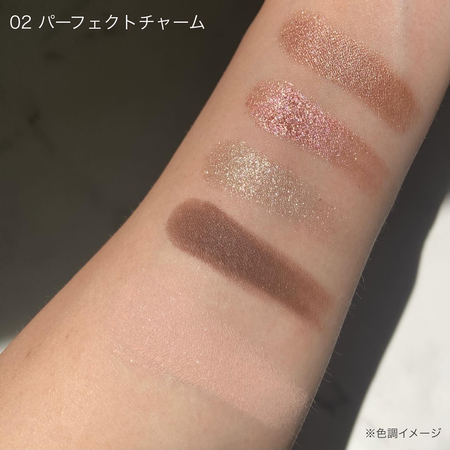 - 「攻めの配色から生まれる新しい可能性」 アンバランスなラメの配合により光彩陸離な目元に主人公の眼差しを演出 point.1 透明感がありながらの高発色 point.2 薄く密着して、色もちが長時間続く point.3 デイリーからパーティールックまで出来る攻めの組み合わせ point.4 チーク、アイブロウなどマルチに使える point.5 こだわり抜いたアンバランスなラメの組み合わせ 01.Love Portion 甘く華やぐ理想的なピンクパレット 愛と幸せのパワーをくれる恋の媚薬 02.Perfect Charm 王道なのに想像を超えたパーフェクトパレット 人の心を惹きつける魅力的なブラウン