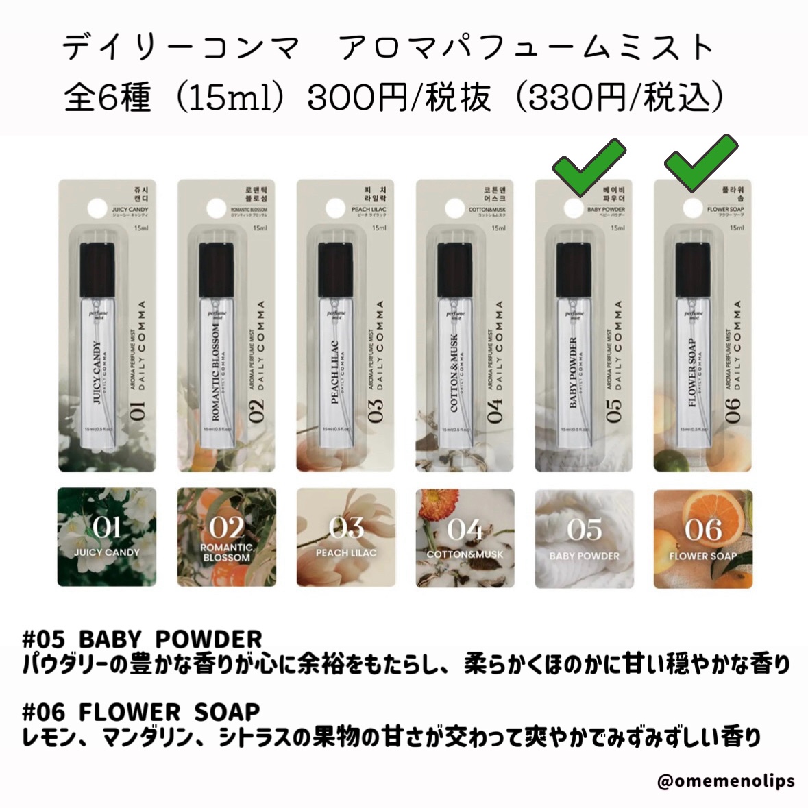 デイリーコンマさまよりご提供いただきました*⑅୨୧୨୧⑅*。韓国発のフレグランスブランドで韓国のダイソーにアロマパフュームミストが置いてあるらしいよ!アロマパフュームミストはお値段なんと330円(税込)小さいからポーチに入れて持ち歩くのもいい...