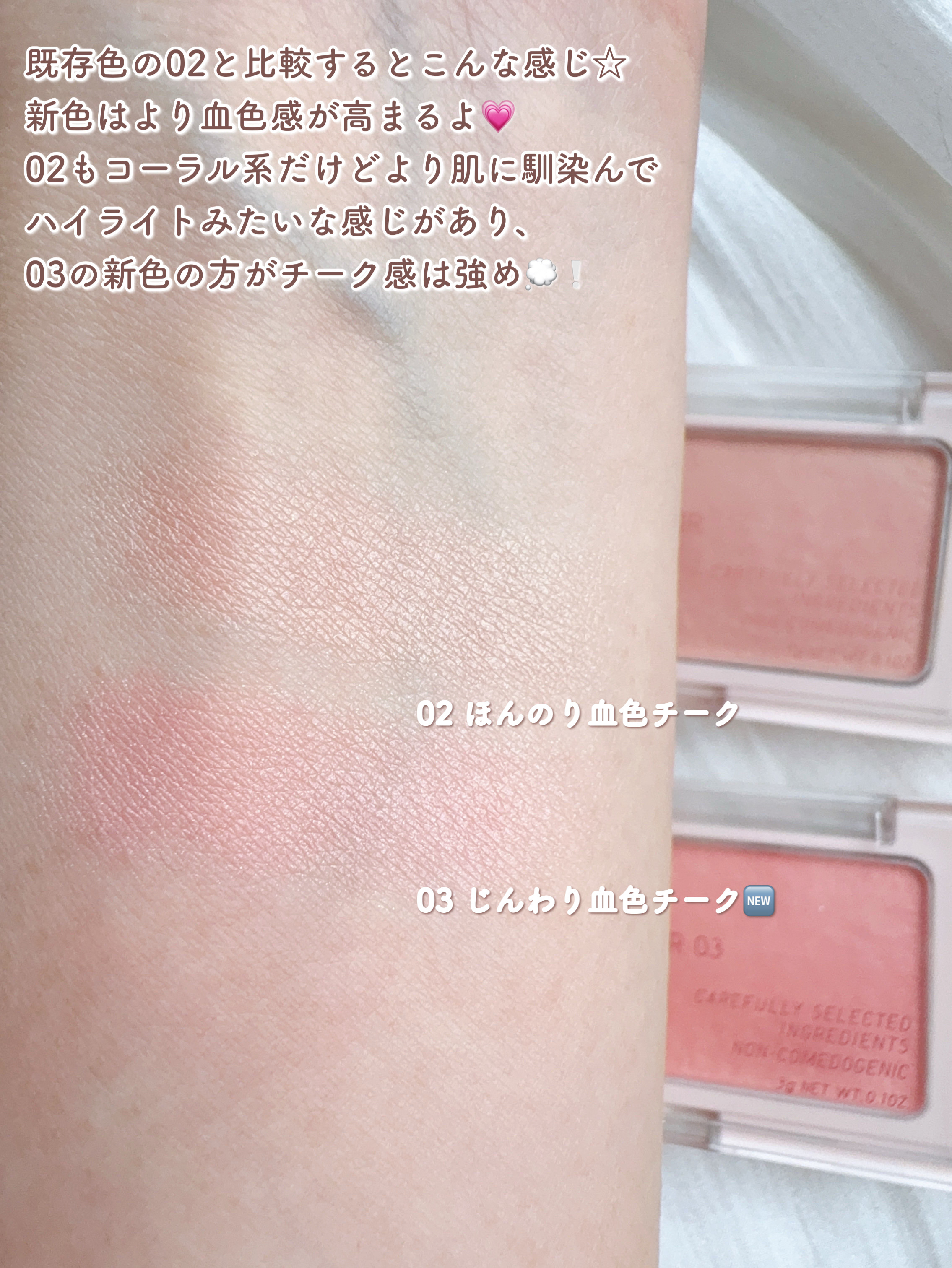 | 薄づきのチークになっています!少しラメ感があり、ツヤが欲しい人にはかなりオススメです。 | 詳細を見る | ||