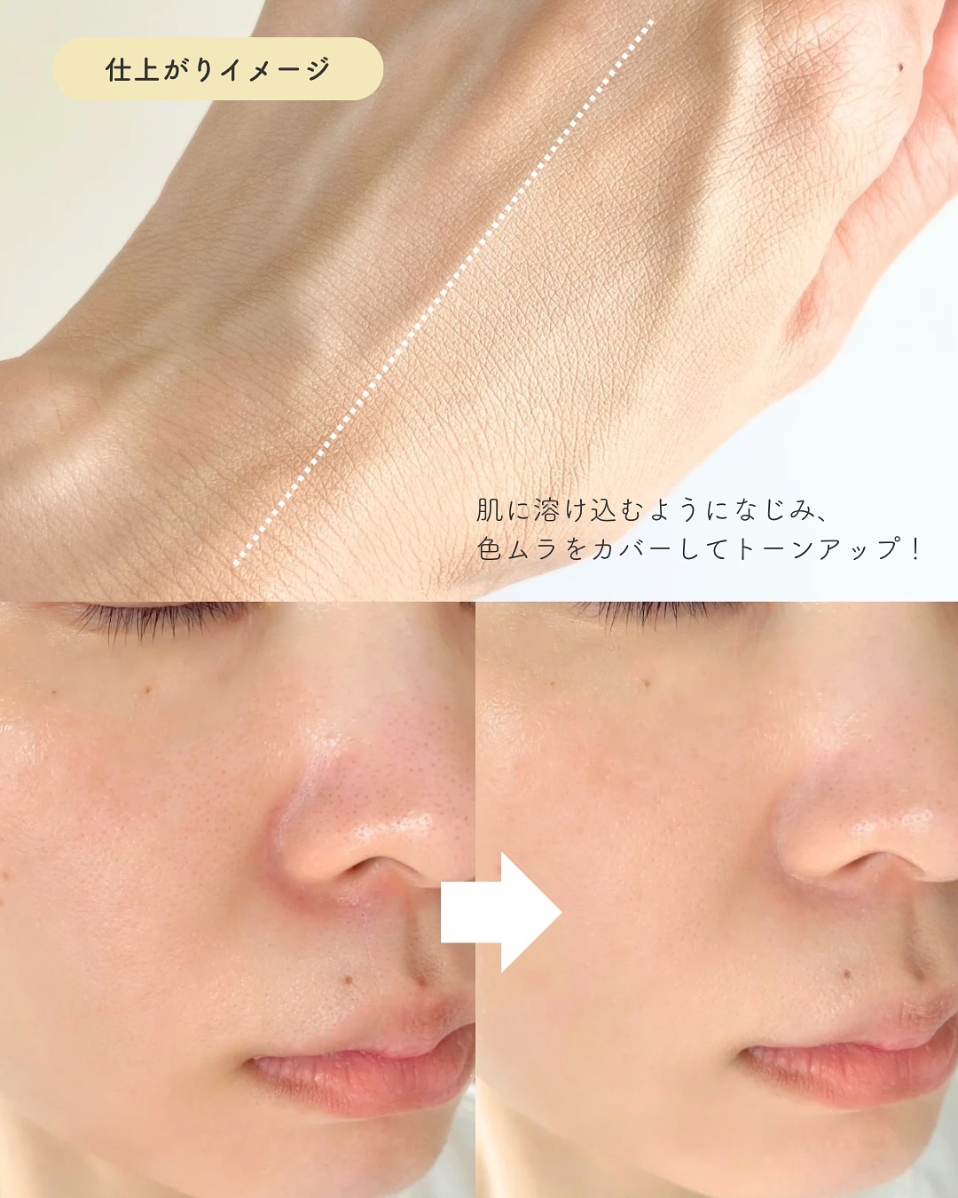 ベージュの方がなじみがよく、肌から浮く感じは皆無で自然にトーンアップできます。 すごく軽い使い心地ですが、なじみのいいカラーのおかげでより毛穴や色むらなどのアラをきれいにカバーできるように感じました。 ラベンダーは、肌の黄み感がかなり抑えられる印象! 透明感を求めるなら圧倒的にこちらで、色白に見えるように感じました。 黄みをカバーできるおかげで、苦手な青みピンクのリップやチークが似合う肌になれたので、ブルベメイクもしたいイエベさんにはラベンダーがおすすめです✨