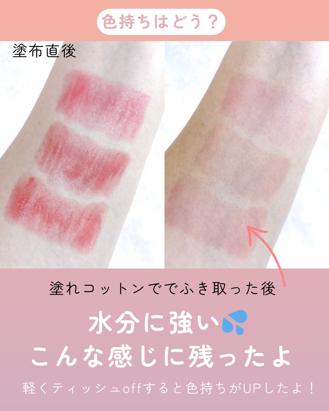 - <01 ライチペシェ> アルキル(C20ー24)ジメチコン、水添ポリイソブテン、ペンタイソステアリン酸ジペンタエリスリチル、オクチルドデカノール、トリ(カプリル酸/カプリン酸)グリセリル、ダイマージリノール酸(フィトステリル/イソステアリル/セチル/ステアリル/ベヘニル)、ラウロイルグルタミン酸ジ(フィトステリル/オクチルドデシル)、パラフィン、ラウロイルグルタミン酸ジ(オクチルドデシル/フィトステリル/ベヘニル)、合成ワックス、イソノナン酸イソトリデシル、水添ココグリセリル、リンゴ酸ジイソステアリル、酸化チタン、マカデミア種子油、ツボクサエキス、キトサン、トリ脂肪酸(C10ー18)グリセリル、合成フルオロフロゴパイト、トリイソステアリン酸ポリグリセリルー2、マイクロクリスタリンワックス、(エチレン/プロピレン)コポリマー、ジイソステアリン酸ポリグリセリルー2、ステアラルコニウムヘクトライト、炭酸プロピレン、トコフェロール、水、アラントイン、ナイアシンアミド、グリセリン、BG、水添レシチン、1,2ーヘキサンジオール、アブラナステロ―ルズ、レチノール、コレステロール、ラウリン酸ポリグリセリルー10、セラミドNP、ステアリン酸水酸化(Al/Mg)、テトラ(ジーt-ブチルヒドロキシヒドロケイヒ酸)ペンタエリスリチル、セチルリン酸K、クエン酸トリス(テトラメチルヒドロキシピペリジノール)、酸化鉄、赤104(1)、赤202、赤227、青1、黄4 <02 ロゼフランボワーズ> アルキル(C20ー24)ジメチコン、水添ポリイソブテン、ペンタイソステアリン酸ジペンタエリスリチル、オクチルドデカノール、トリ(カプリル酸/カプリン酸)グリセリル、ダイマージリノール酸(フィトステリル/イソステアリル/セチル/ステアリル/ベヘニル)、ラウロイルグルタミン酸ジ(フィトステリル/オクチルドデシル)、パラフィン、ラウロイルグルタミン酸ジ(オクチルドデシル/フィトステリル/ベヘニル)、合成ワックス、イソノナン酸イソトリデシル、水添ココグリセリル、リンゴ酸ジイソステアリル、酸化チタン、マカデミア種子油、ツボクサエキス、キトサン、トリ脂肪酸(C10ー18)グリセリル、合成フルオロフロゴパイト、トリイソステアリン酸ポリグリセリルー2、マイクロクリスタリンワックス、(エチレン/プロピレン)コポリマー、ジイソステアリン酸ポリグリセリルー2、ステアラルコニウムヘクトライト、炭酸プロピレン、トコフェロール、水、アラントイン、ナイアシンアミド、グリセリン、BG、水添レシチン、1,2ーヘキサンジオール、アブラナステロ―ルズ、レチノール、コレステロール、ラウリン酸ポリグリセリルー10、セラミドNP、ステアリン酸水酸化(Al/Mg)、テトラ(ジーt-ブチルヒドロキシヒドロケイヒ酸)ペンタエリスリチル、セチルリン酸K、クエン酸トリス(テトラメチルヒドロキシピペリジノール)、酸化鉄、赤202、青1、黄5 <03 グァバシェイク> アルキル(C20ー24)ジメチコン、水添ポリイソブテン、ペンタイソステアリン酸ジペンタエリスリチル、オクチルドデカノール、トリ(カプリル酸/カプリン酸)グリセリル、ダイマージリノール酸(フィトステリル/イソステアリル/セチル/ステアリル/ベヘニル)、ラウロイルグルタミン酸ジ(フィトステリル/オクチルドデシル)、パラフィン、ラウロイルグルタミン酸ジ(オクチルドデシル/フィトステリル/ベヘニル)、合成ワックス、イソノナン酸イソトリデシル、水添ココグリセリル、リンゴ酸ジイソステアリル、トリイソステアリン酸ポリグリセリルー2、酸化チタン、マカデミア種子油、ツボクサエキス、キトサン、トリ脂肪酸(C10ー18)グリセリル、合成フルオロフロゴパイト、マイクロクリスタリンワックス、(エチレン/プロピレン)コポリマー、ジイソステアリン酸ポリグリセリルー2、ステアラルコニウムヘクトライト、炭酸プロピレン、トコフェロール、水、アラントイン、ナイアシンアミド、グリセリン、BG、水添レシチン、1,2ーヘキサンジオール、アブラナステロ―ルズ、レチノール、コレステロール、ラウリン酸ポリグリセリルー10、セラミドNP、ステアリン酸水酸化(Al/Mg)、テトラ(ジーt-ブチルヒドロキシヒドロケイヒ酸)ペンタエリスリチル、セチルリン酸K、クエン酸トリス(テトラメチルヒドロキシピペリジノール)、酸化鉄、赤104(1)、赤201、赤202、黄4、黄5