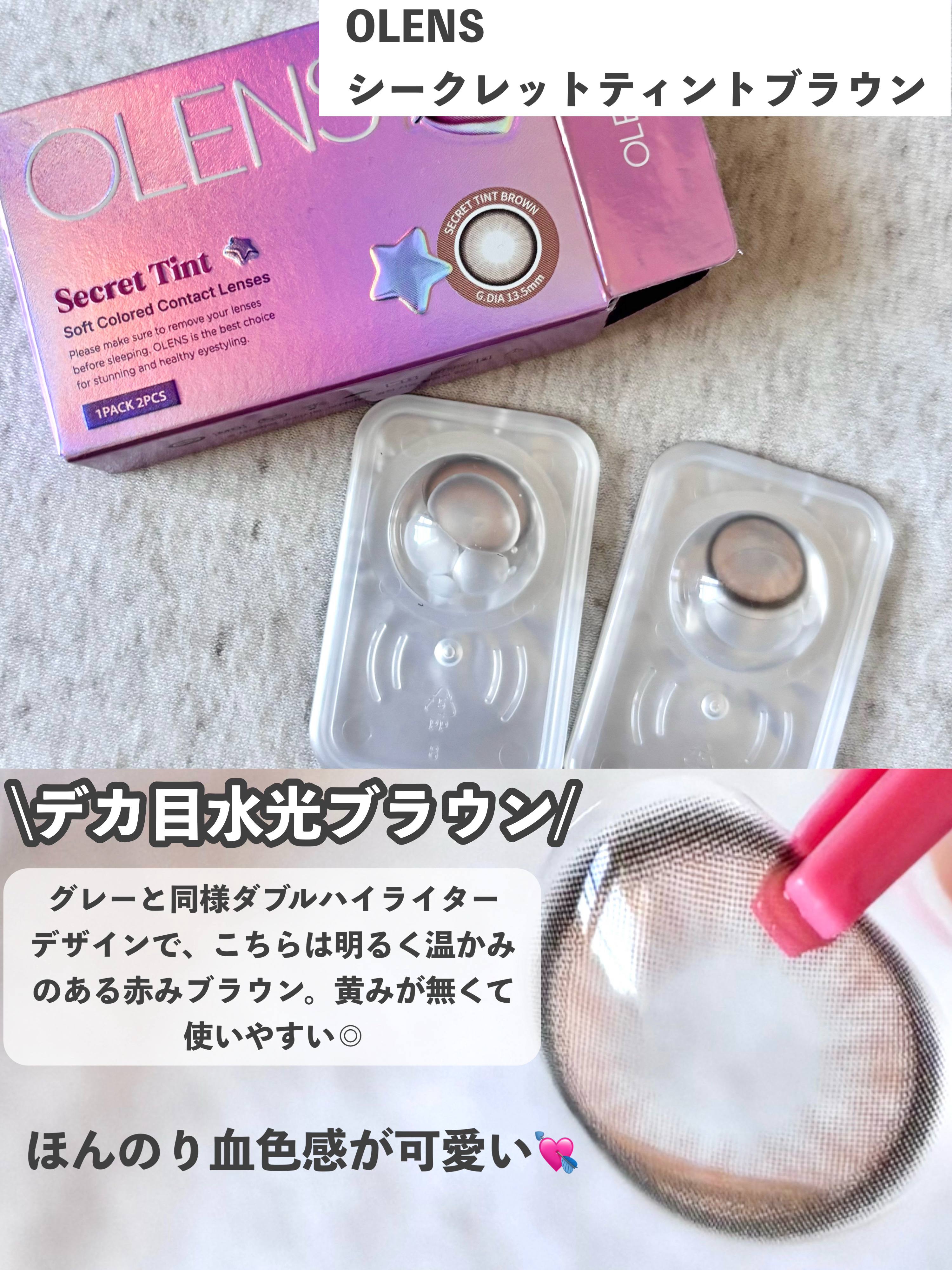 \OLENS新作デカ目水光カラコン/シークレットティントブラウンシークレットティントグレー1Month/13.5着色直径/14.5全体直径明るめのカラーと薄めのダブルハイライターでうるツヤな瞳に見せてくれるデカ目水光カラコンだよー✨️くるくる...