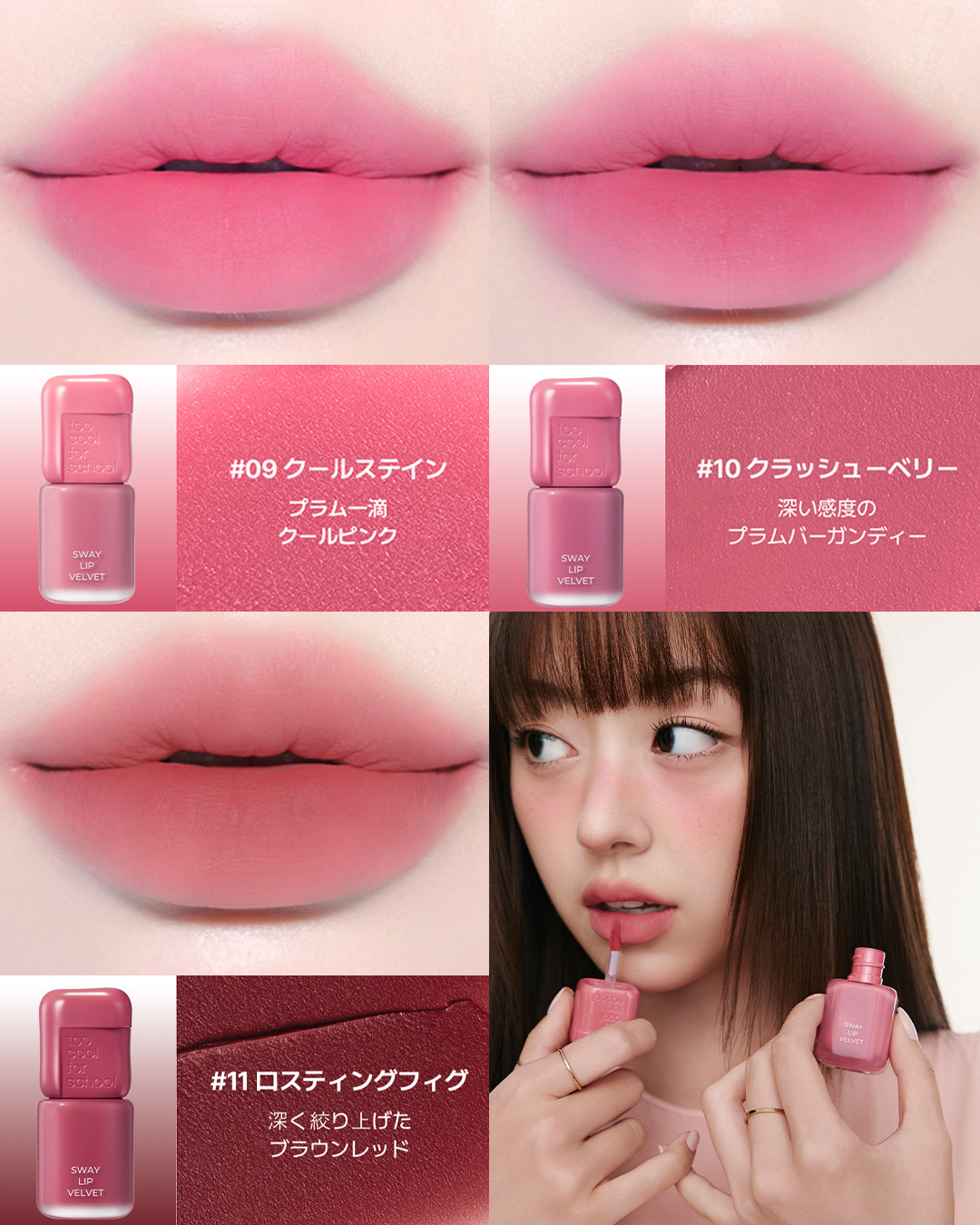 乾燥しないやわらかマットリップTooCoolForSchoolスウェイリップベルベット01ヌードホイップ05ロージーオート各1,740円(税込)乾燥しないやわらかマットリップTooCoolForSchoolスウェイリップベルベットべたつくオイ...