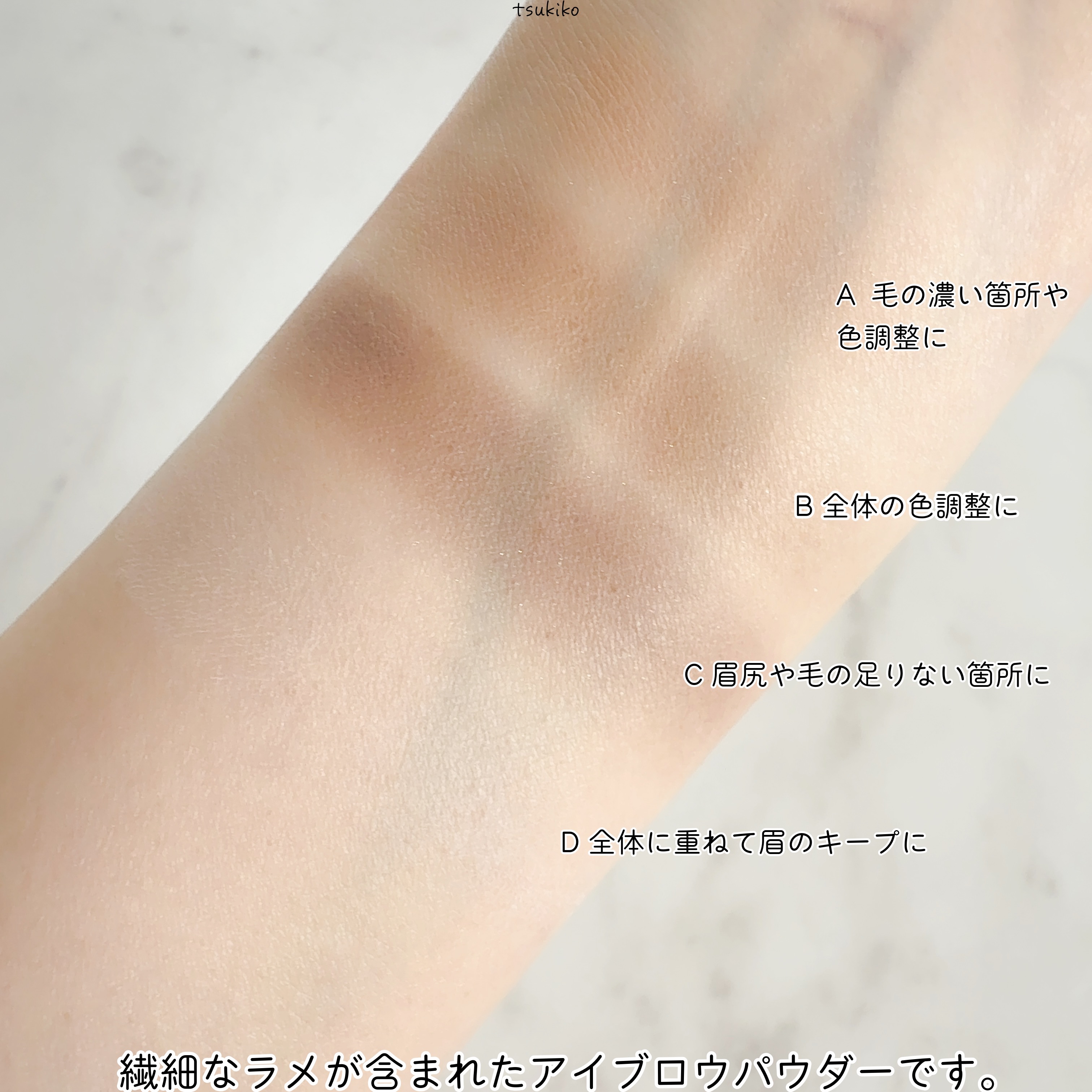 - 簡単キレイ! ふんわりパウダーとこだわりブラシで、消えにくい(*)眉。 b idolから新定番❤アイブロウシリーズが登場!! ふんわり仕上がるカラーパウダー3色と、消えにくい(*)眉が続くフィックスパウダーを1つのパレットにしました! ベーシックに使える配色で、眉のトーンが思いのまま♪ カラーパウダーに微細ラメを配合。僅かにに輝き、ふんわりとした抜け感眉に♥ *:密着性のあるパウダーが皮脂を吸着し、コーティング。 ※全てメイクアップ効果 ※効果・持続時間には個人差がございます ●髪色や眉の色に合わせて使えちゃう♡ ●フィックスパウダーは密着性のあるパウダーが皮脂を吸着し、コーティング♡ ●オリジナルのWエンドMiniアイブロウブラシ付き♡ A:ライトカラー 毛の濃い箇所や色味調整に♡ B:ニュアンスカラー 全体の色調整に♡ C:ダークカラー 眉尻や毛の足りない箇所に♡ D:フィックスパウダー 全体に重ねて眉のキープに♡