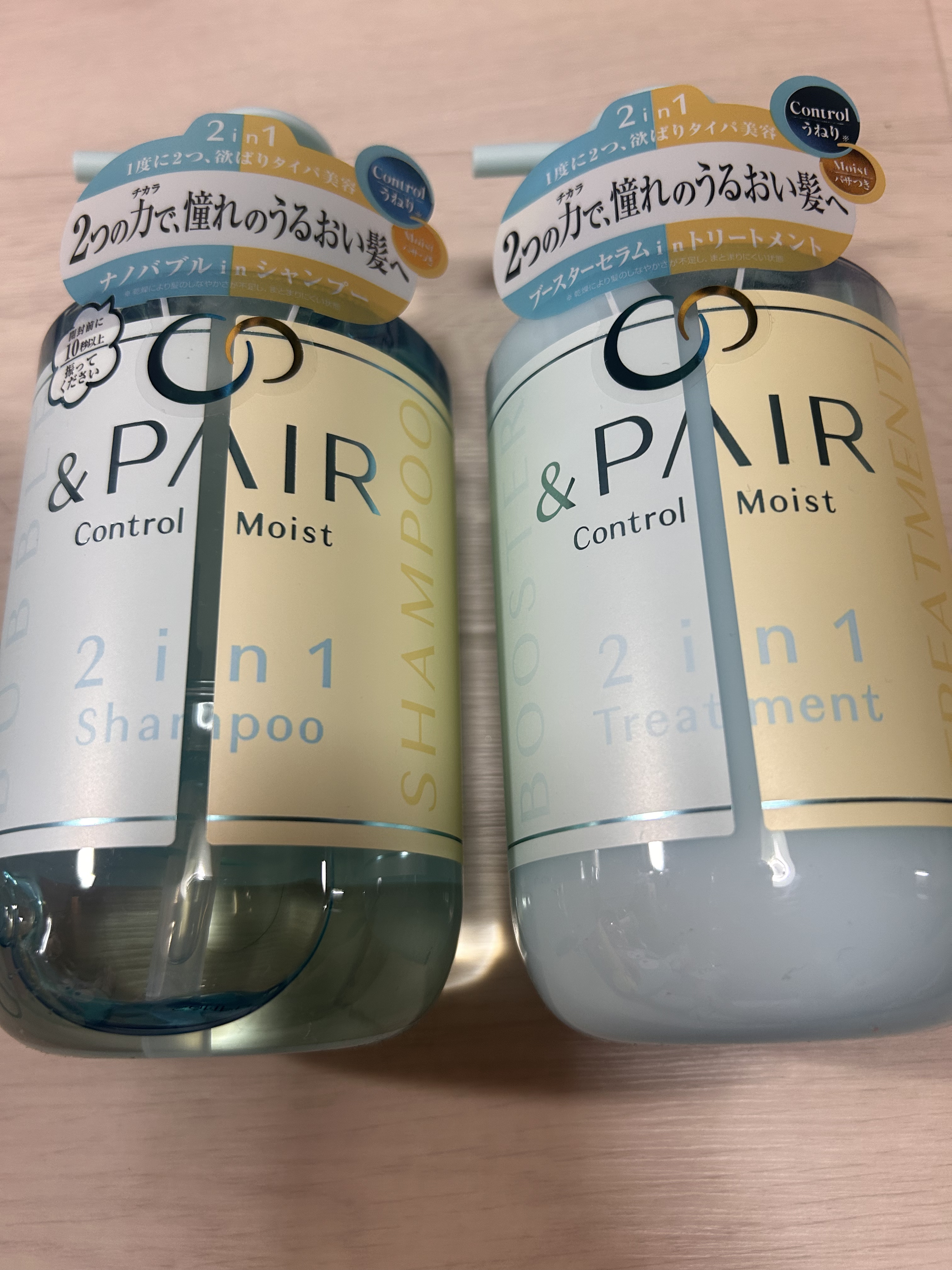 - &PAIRは「タイパ美容」に着目し、1本で2つの機能を持ち合わせたヘアケアブランドです。 コントロール モイストシリーズはうねり※1とパサつきを同時にケアし、しっとりな仕上がりに導きます。 シャンプーにはナノバブルパーツが採用されており、本体を振ることでナノバブルを発生させることができます。 ナノサイズの微細な泡で毛穴の皮脂汚れを滑らかに洗い流します。 ヘアトリートメントは導入ブースター成分*1で保湿成分の浸透をサポートし、 髪のパサつきに浸透保湿ケアができる導入ブースター機能のあるヘアトリートメント。 製品の90%以上が保湿&うねり※1ケア成分*2で構成し※2、指通り滑らかなしっとり髪へ導きます。 石油系洗浄成分不使用・パラベン不使用・動物実験不実施(製品として)・合成着色料不使用・サルフェート不使用(ラウレス硫酸Na)・鉱物油不使用 ※1 乾燥により髪のしなやかさが不足し、まとまりにくい状態 ※2 基剤を除く、水を含む *1 アルギニン、加水分解ケラチン(羊毛)、加水分解ヒアルロン酸(全て保湿) *2 γードコサラクトン(補修)