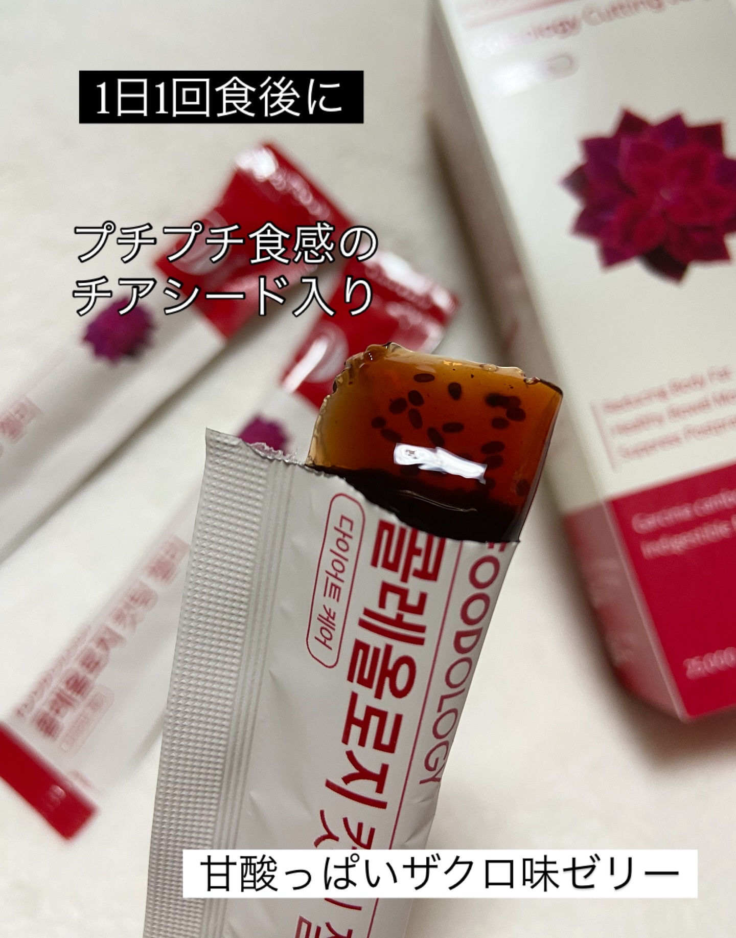 - 生活習慣が気になる方や、ダイエットのサポートにおすすめの美容ゼリーです。 食べ過ぎた日に1本でカロリー対策ができ、チアシード入りで満腹感も味わえます。