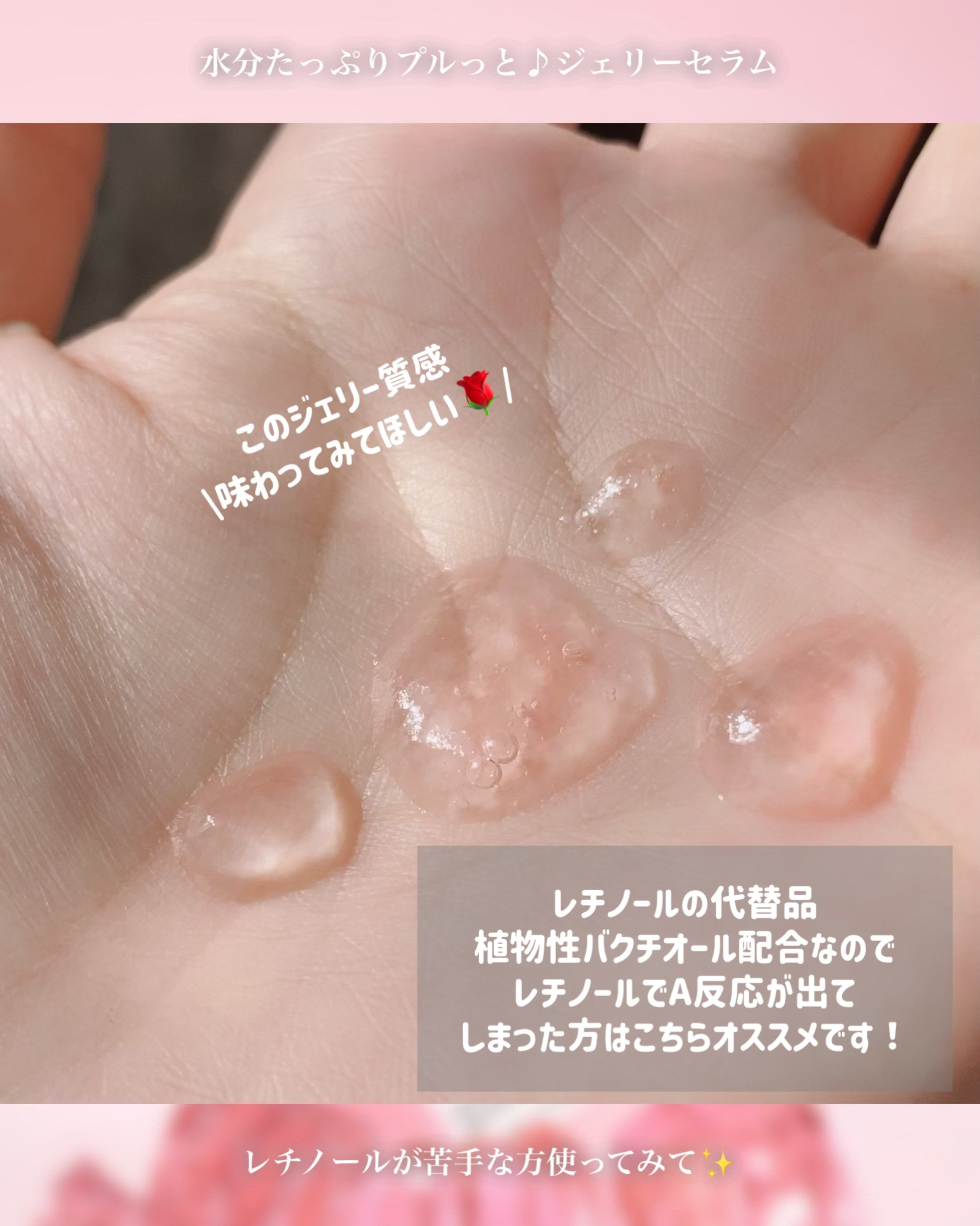 - ぷるんと弾けるピンクジェリーが、肌の角質層までうるおいを届け、ハリと輝きを保つ。 高品質「PDRN※1」×「バクチオール※2」で、ゆらぎにくい、弾むような肌へ。 1.うるおいを届け、弾むような肌に ダマスクローズ由来のPDRN※1 は、肌に寄り添う発想から生まれたもの。肌をいきいきとした印象へと導きながら、肌本来のハリ・弾力を引き出し、なめらかでキメの整った肌へ。 2.未来の自分のために、エイジングケア※5の第一歩として 植物由来のバクチオール※2 とNMN※6 が、肌本来のバリア機能を高めながら、ハリのある肌へと導きます。敏感な肌にもやさしい、穏やかなエイジングケア※5 が可能です。 3.植物由来成分で、優しくケア 肌に負担をかけにくい、こだわりの植物由来成分を配合。「皮膚低刺激テスト※7」をクリアしているため、敏感肌の方でも安心して日常のケアに取り入れることができます。 4.まるでジェリーな新感覚テクスチャー ぷるんとしたみずみずしいテクスチャーにより、べたつかず肌の角質層まで浸透※8。機能性だけでなく使い心地にも優れた、新感覚美容液となっています。 ※1) DNA-Na(整肌成分) ※2) 整肌成分 ※5) エイジングケアとは年齢に応じたお手入れのこと ※6) ニコチンアミドモノヌクレオチド(整肌成分) 2025年5月9日(金)よりQoo10にて先行発売