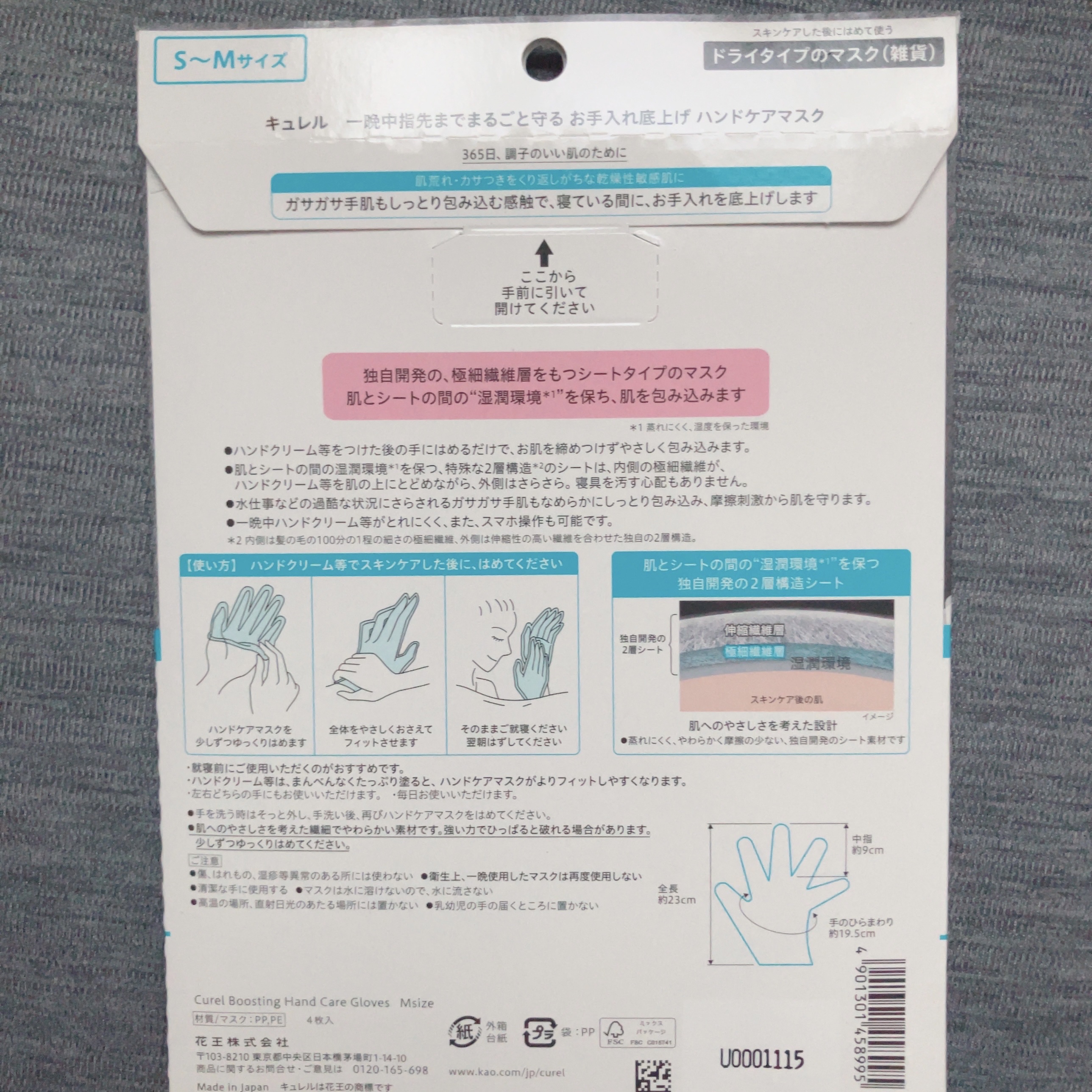 - 【敏感肌用】 肌荒れ・カサつきをくり返しがちな乾燥性敏感肌のお手入れを底上げ。 独自開発 2層構造シートのハンドケアマスク。 ハンドクリーム等をつけた後の手にはめるだけ。 肌とシートの間の湿潤環境*1を保ち、 肌をやさしく包み込みます。 水仕事などの過酷な状況にさらされるガサガサ手肌もしっとり包み込む感触で、寝ている間に、お手入れを底上げします。 ●ハンドクリーム等をつけた後の手にはめるだけで、お肌を締めつけずやさしく包み込みます。 特殊な2層構造*2のシートは、内側の極細繊維が、ハンドクリーム等を 肌の上にとどめながら、外側はさらさら。 寝具を汚す心配もありません。 シートが手肌をなめらかにしっとり包み込み、摩擦刺激から肌を 守ります。 一晩中ハンドクリーム等がとれにくく、また、 スマホ操作も可能です。 *1 蒸れにくく、湿度を保った環境 *2 内側は髪の毛の100分の1程の細さの極細繊維、外側は伸縮性の高い繊維を合わせた独自の2層構造 9月1日より @cosme TOKYO および @cosme SHOPPING にて先行発売 商品に関するお問い合わせ 受付時間9:00~17:00(土曜・日曜・祝日除く) *製品の誤飲・誤食など緊急の場合は、受付時間外でもお電話ください キュレル:0120-165-698