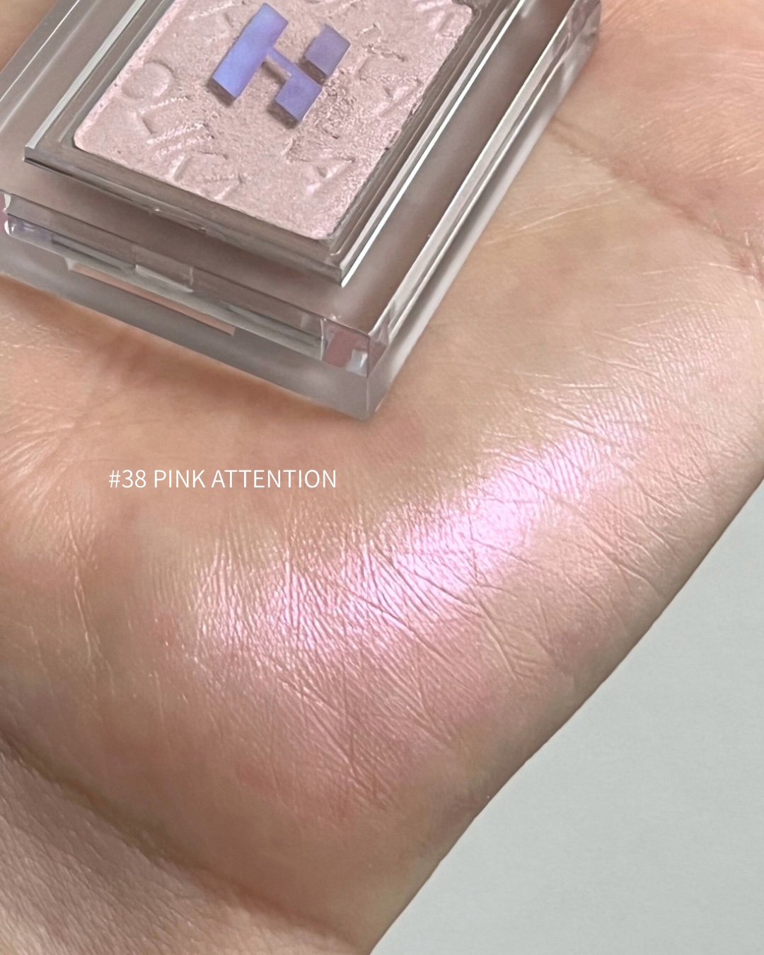 38が特に好み ( ᵕ̩̩ ᵕ )♡ ピンクビームってかわいすぎる ( ᵕ̩̩ ᵕ ) 角度によって色が違うけど、38がピンクビームで、39が肌なじみのいい感じ! アイシャドウというよりはハイライトに使う☺️