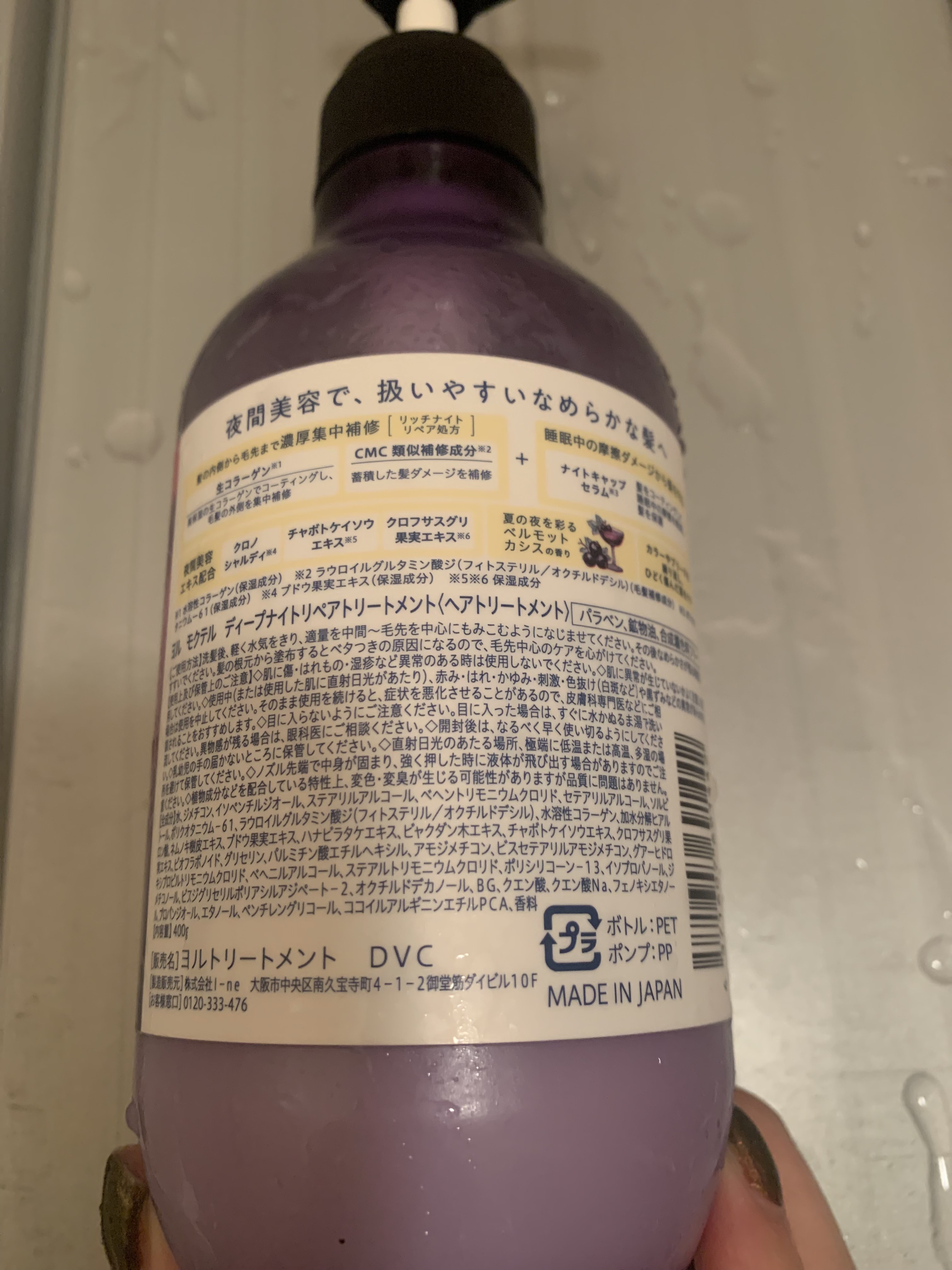 - 夜間美容で、扱いやすいなめらかな髪へ 髪の内側から毛先まで濃厚集中補修?[リッチナイトリペア処方] 生コラーゲン※1 高保湿の生コラーゲンでコーティングし、毛髪の外側を集中補修 CMC類似補修成分※2 蓄積した髪ダメージを補修 + 睡眠中の摩擦ダメージから髪を守る ナイトキャップセラム※3 髪をコーティングして睡眠中の摩擦を軽減し髪を保護 地肌の乾燥をケア 夜間美容エキス配合 クロノシャルディ※4 チャボトケイソウエキス※5 安らぎたい夜にベルガモット&ムスクの香り カラーやブリーチを繰り返し、ひどく傷んだ髪をケア ※1 水溶性コラーゲン(保湿成分) ※2 ラウロイルグルタミン酸ジ(フィトステリル/オクチルドデシル)(毛髪補修成分) ※3 ポリクオタニウムー61(保湿成分) ※4 ブドウ果実エキス(保湿成分) ※5 保湿成分 シリコン(シャンプーのみ)、パラベン、鉱物油、合成着色料フリー