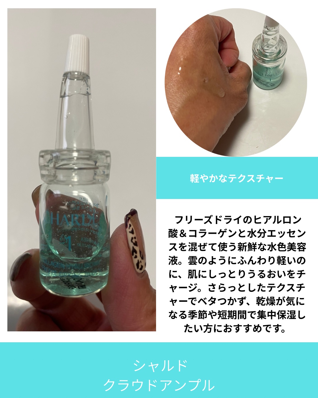CHARDEクラウドアンプル2種類を混ぜて使う水色の美容液🩵1剤はヒアルロン酸とコラーゲン配合のフリーズドライ2剤は水分エッセンスとなっています💫1剤に2剤を混ぜてよく振ってから使用🙌衛生面で10日以内に使い切るのがおすすめなのだそう👀とろり...