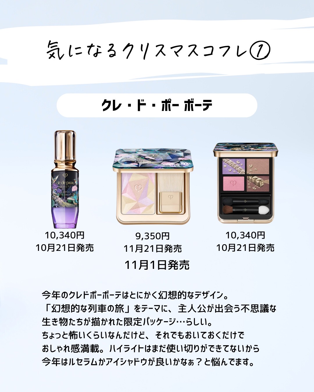 毎年大人気のEleganceのクリスマスコフレをご紹介!昨年は完売で手に入れられなかったので、やっとお迎えできて嬉しいです♡ エレガンスの価格度外視のコスメセット!アイシャドウパレット・リップ・マスカラ・ジュレアイシャドウ・クリームフェイスカラー・メイクアップベースの6種が一気に試せるかなりお得感のあるコフレ…♥️ どれも使うたびにふんわりと上品な化粧品の香りがするのがたまらない…♪さらにすべてのパッケージがきらきら輝くゴールドで気分が上がる…!