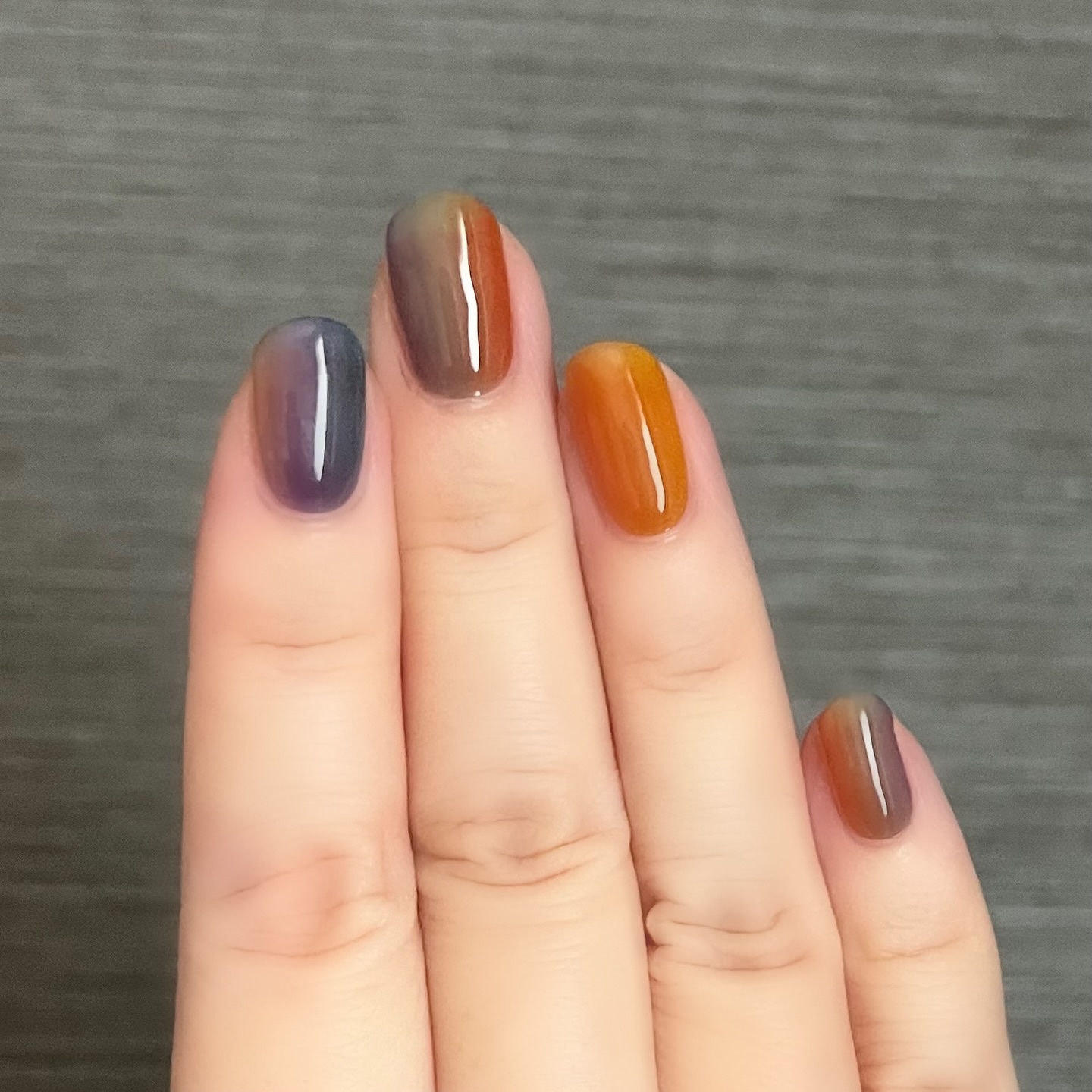 ohoraネイルシールセルフネイルキット、秋らしい色でネイルしてみました✨️色番…NP-048-JNMermaidGlow/ND-181NGradientオホーラネイルシールは、貼ってUVランプで固めるだけで完成!ジェルなので持ちがよくて、ハ...