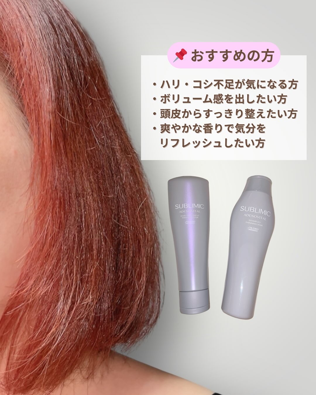 サブリミックのアデノバイタルシャンプー・トリートメント頭皮と髪にマイルドな洗い心地とのこと。実際に使ってみると、きめ細かな泡立ちで、髪を優しく洗い上げてくれるような使用感です。洗い流した後は、ふんわりと軽い仕上がりになるように感じました。ユー...