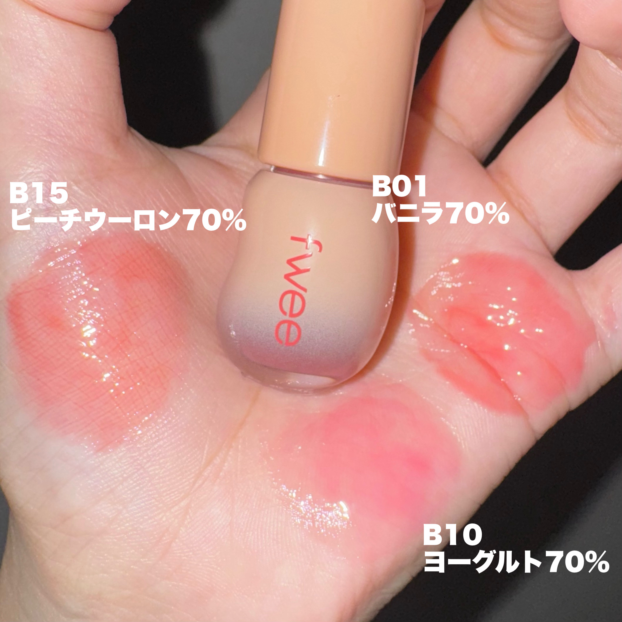 fweeの新色「ピーチ」💗 メガ割でfweeアイテム3000円以上購入者限定(数量限定)でピーチ70%が貰えるとの情報を知り、、、もちろんゲットしちゃいました~!!✨ 一番似てるバニラよりピンク感強めのコーラルピンクカラー💗 イエベ、ブルベ関係なく使いやすいピンクかな?という印象。 とにかく色味が天才的!! 本当にfweeはめちゃくちゃセンスある。(誰)