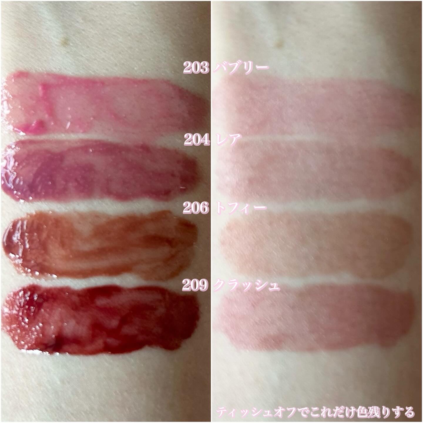 - <201 フェアリー> ダイマージリノール酸ジイソステアリル、ジフェニルシロキシフェニルトリメチコン、ビスジグリセリルポリアシルアジペート-2、水、ジフェニルジメチコン、水添ポリイソブテン、セチルPEG/PPG-10/1ジメチコン、ポリソルベート60、ペンチレングリコール、グリセリン、イソステアリン酸ポリグリセリル-4、フェノキシエタノール、1,2-ヘキサンジオール、セテアレス-20、酸化チタン (CI 77891)、(アクリル酸ヒドロキシエチル/アクリロイルジメチルタウリンNa)コポリマー、ステビオシド、スクワラン、香料、ジラウラミドグルタミドリシンNa、エチルヘキシルグリセリン、エチレンジアミンジコハク酸3Na、赤色227号 (CI 17200)、水酸化Al、黄色5号 (CI 15985)、ポリアクリル酸アンモニウム、イソステアリン酸ソルビタン、黄色4号 (CI 19140)、BG、赤色223号 (CI 45410)、青色1号 (CI 42090)、アラントイン、パンテノール、ツボクサエキス、ヒアルロン酸、加水分解ヒアルロン酸、ヒアルロン酸Na <203 バブリー> ダイマージリノール酸ジイソステアリル、ジフェニルシロキシフェニルトリメチコン、ビスジグリセリルポリアシルアジペート-2、水、ジフェニルジメチコン、水添ポリイソブテン、セチルPEG/PPG-10/1ジメチコン、ポリソルベート60、ペンチレングリコール、グリセリン、イソステアリン酸ポリグリセリル-4、フェノキシエタノール、1,2-ヘキサンジオール、セテアレス-20、(アクリル酸ヒドロキシエチル/アクリロイルジメチルタウリンNa)コポリマー、ステビオシド、酸化チタン (CI 77891)、スクワラン、香料、ジラウラミドグルタミドリシンNa、エチルヘキシルグリセリン、赤色227号 (CI 17200)、エチレンジアミンジコハク酸3Na、黄色5号 (CI 15985)、イソステアリン酸ソルビタン、水酸化Al、ポリアクリル酸アンモニウム、黄色4号 (CI 19140)、BG、青色1号 (CI 42090)、アラントイン、パンテノール、ツボクサエキス、ヒアルロン酸、加水分解ヒアルロン酸、ヒアルロン酸Na <204 レア> ダイマージリノール酸ジイソステアリル、ジフェニルシロキシフェニルトリメチコン、ビスジグリセリルポリアシルアジペート-2、水、ジフェニルジメチコン、水添ポリイソブテン、セチルPEG/PPG-10/1ジメチコン、ポリソルベート60、ペンチレングリコール、グリセリン、イソステアリン酸ポリグリセリル-4、フェノキシエタノール、1,2-ヘキサンジオール、セテアレス-20、(アクリル酸ヒドロキシエチル/アクリロイルジメチルタウリンNa)コポリマー、酸化チタン (CI 77891)、ステビオシド、スクワラン、香料、ジラウラミドグルタミドリシンNa、エチルヘキシルグリセリン、赤色227号 (CI 17200)、黄色5号 (CI 15985)、エチレンジアミンジコハク酸3Na、イソステアリン酸ソルビタン、水酸化Al、ポリアクリル酸アンモニウム、黄色4号 (CI 19140)、青色1号 (CI 42090)、BG、アラントイン、パンテノール、ツボクサエキス、ヒアルロン酸、加水分解ヒアルロン酸、ヒアルロン酸Na <205 ハニーデュー> ダイマージリノール酸ジイソステアリル、ジフェニルシロキシフェニルトリメチコン、ビスジグリセリルポリアシルアジペート-2、水、ジフェニルジメチコン、水添ポリイソブテン、セチルPEG/PPG-10/1ジメチコン、ポリソルベート60、ペンチレングリコール、グリセリン、イソステアリン酸ポリグリセリル-4、フェノキシエタノール、1,2-ヘキサンジオール、セテアレス-20、(アクリル酸ヒドロキシエチル/アクリロイルジメチルタウリンNa)コポリマー、酸化チタン (CI 77891)、ステビオシド、スクワラン、香料、ジラウラミドグルタミドリシンNa、エチルヘキシルグリセリン、赤色227号 (CI 17200)、黄色5号 (CI 15985)、エチレンジアミンジコハク酸3Na、イソステアリン酸ソルビタン、水酸化Al、ポリアクリル酸アンモニウム、黄色4号 (CI 19140)、青色1号 (CI 42090)、BG、アラントイン、パンテノール、ツボクサエキス、ヒアルロン酸、加水分解ヒアルロン酸、ヒアルロン酸Na <206 トフィー> ダイマージリノール酸ジイソステアリル、ジフェニルシロキシフェニルトリメチコン、ビスジグリセリルポリアシルアジペート-2、水、ジフェニルジメチコン、水添ポリイソブテン、セチルPEG/PPG-10/1ジメチコン、ポリソルベート60、ペンチレングリコール、グリセリン、イソステアリン酸ポリグリセリル-4、フェノキシエタノール、1,2-ヘキサンジオール、セテアレス-20、(アクリル酸ヒドロキシエチル/アクリロイルジメチルタウリンNa)コポリマー、ステビオシド、スクワラン、香料、ジラウラミドグルタミドリシンNa、酸化チタン (CI 77891)、エチルヘキシルグリセリン、黄色5号 (CI 15985)、エチレンジアミンジコハク酸3Na、黄色4号 (CI 19140)、赤色227号 (CI 17200)、イソステアリン酸ソルビタン、赤色223号 (CI 45410)、青色1号 (CI 42090)、水酸化Al、ポリアクリル酸アンモニウム、BG、アラントイン、パンテノール、ツボクサエキス、ヒアルロン酸、加水分解ヒアルロン酸、ヒアルロン酸Na <207 フレイム> ダイマージリノール酸ジイソステアリル、ジフェニルシロ
