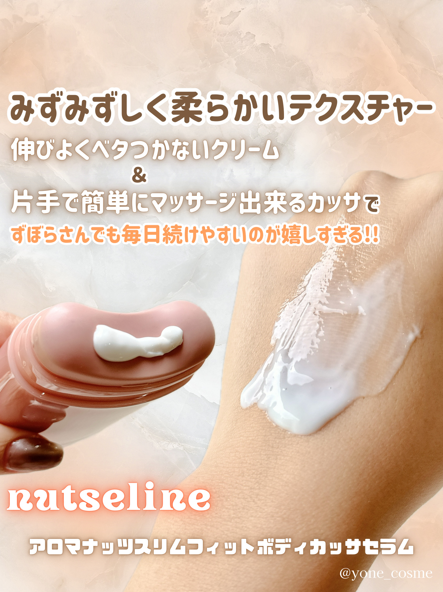 憎きセルライト。。本日のメモ✍️nutseline♡ローリングカッサセラム♡肩首脚、気になるところに使える!カッサ付きのセルライトクリームです!植物性レチノール×VEAGANコラーゲンシナジー効果でハリ感アップ!ダイヤルをくるくるするとクリー...