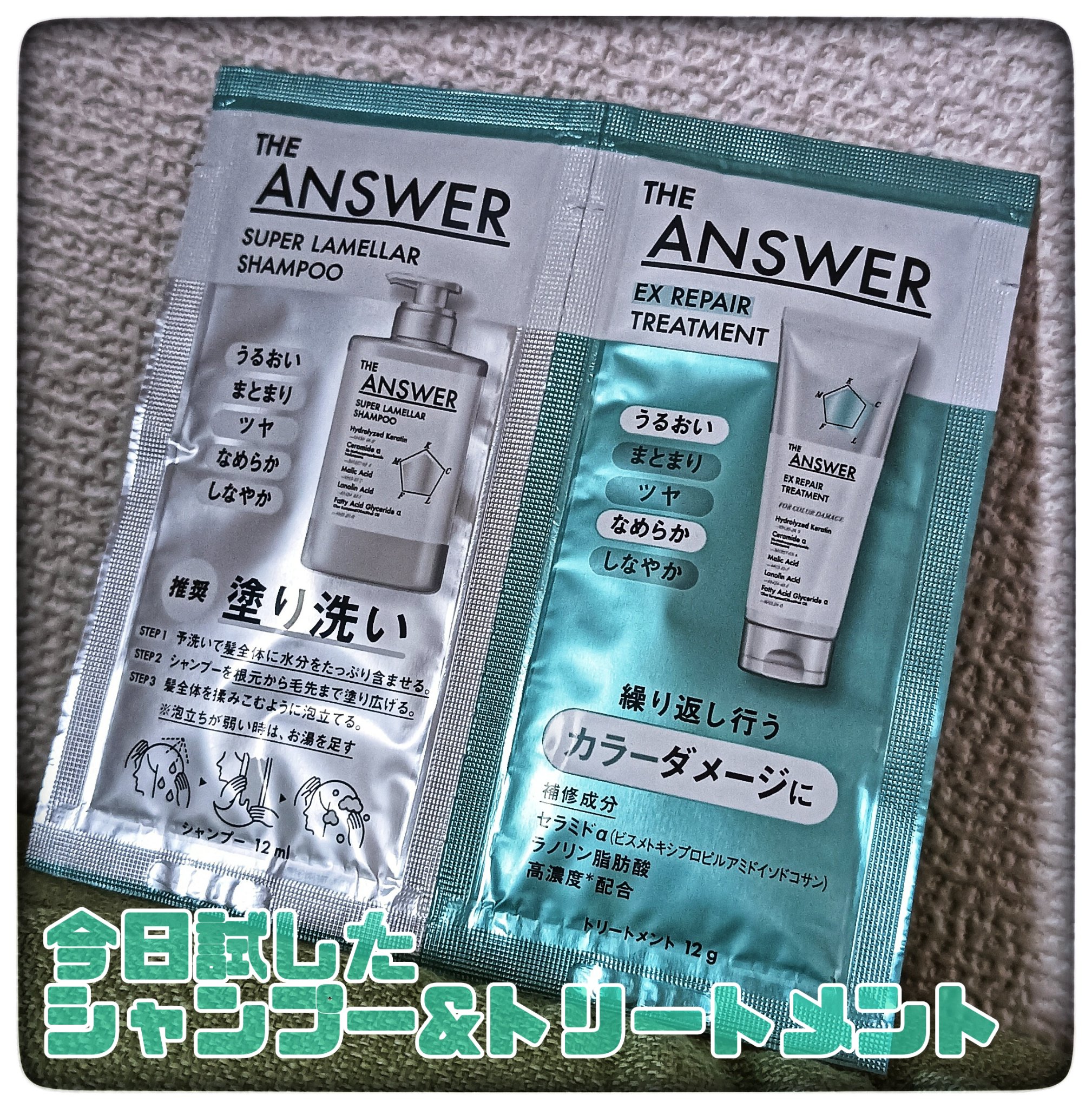 美髪5大必須成分配合のTHE ANSWERのシャントリ ✨ シャンプー内に構築したラメラ層にケア成分を蓄えるラメラプラットフォーム技術採用✨ シャンプーは塗り洗いを推奨してるの❣️ 充分に濡らした髪にシャンプーを塗り広げて、それから泡立てて洗う🫧 ダメージ要因別に美髪5大必須成分(補修)の配合量を調節✨ 💚EX REPAIR TREATMENT カラーダメージに 💛EX GLOSS TREATMENT 熱ダメージに 💜EX MOIST TREATMENT 日常ダメージに