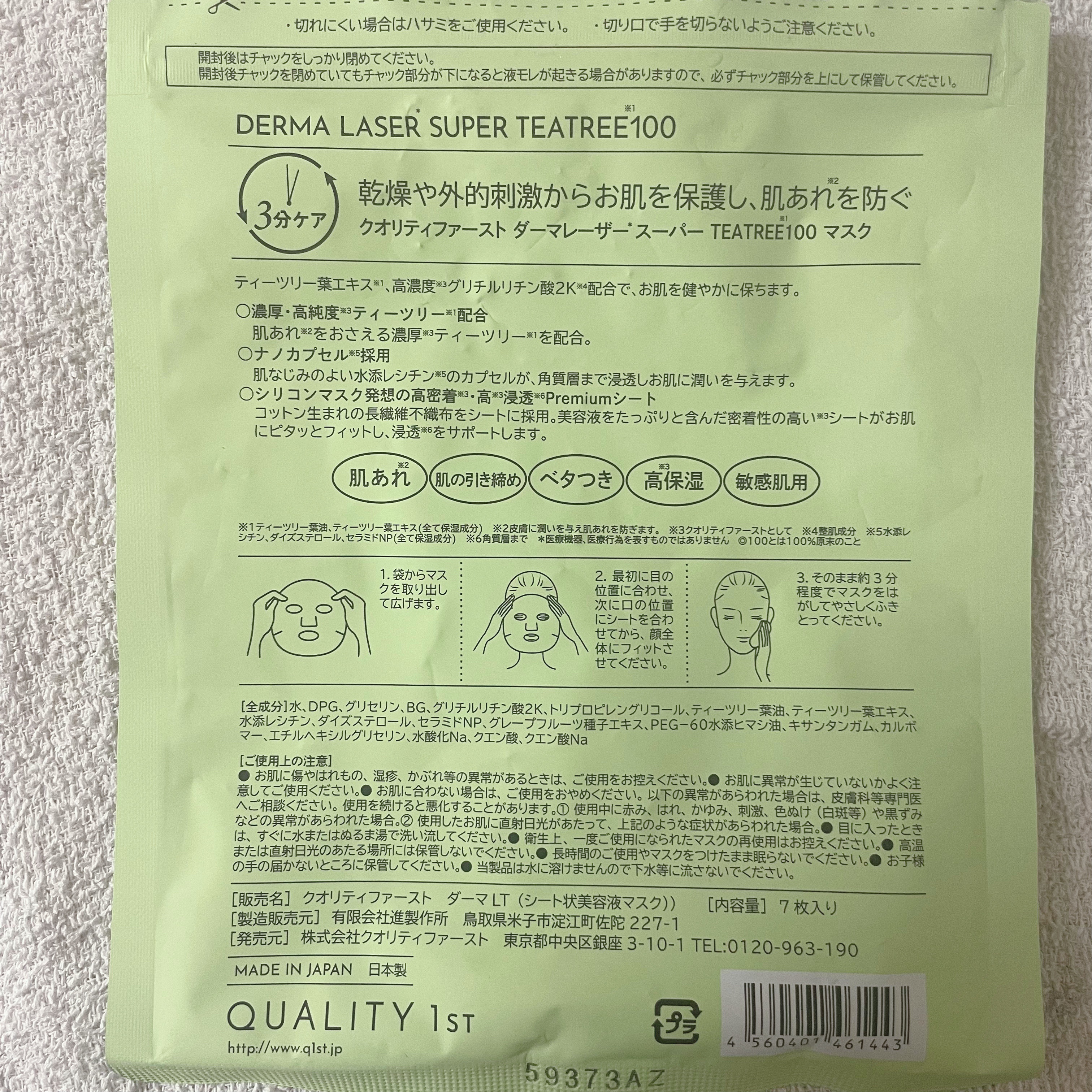 クオリティファーストダーマレーザースーパーTEATREE100マスク¥7707枚入り・濃厚・高純度ティーツリー配合・ナノカプセルテクノロジー採用・シリコンマスク発想の高密着、高浸透Premiumシート液もヒタヒタでシートもガーゼぽくて肌に密着...
