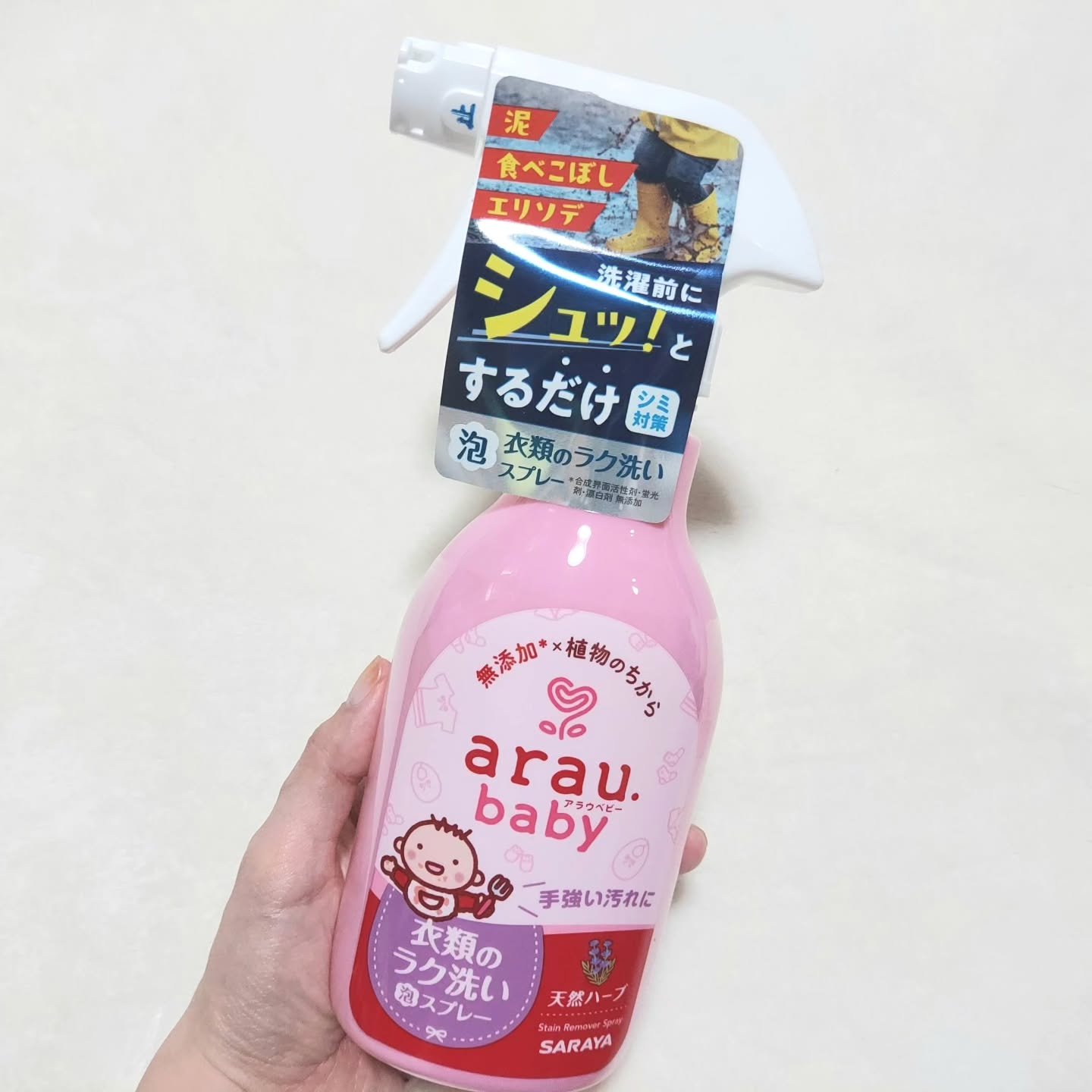 アラウ.ベビー衣類のラク洗い泡スプレー洗浄成分は高い洗浄力と肌へのやさしさを両立した植物うまれの衣料用せっけん汚れにシュッとスプレーしたあと洗濯機でいつも通り洗うだけ手間なしでキレイになるから助かってます。我が家では大人のワイシャツ襟や袖の汚...