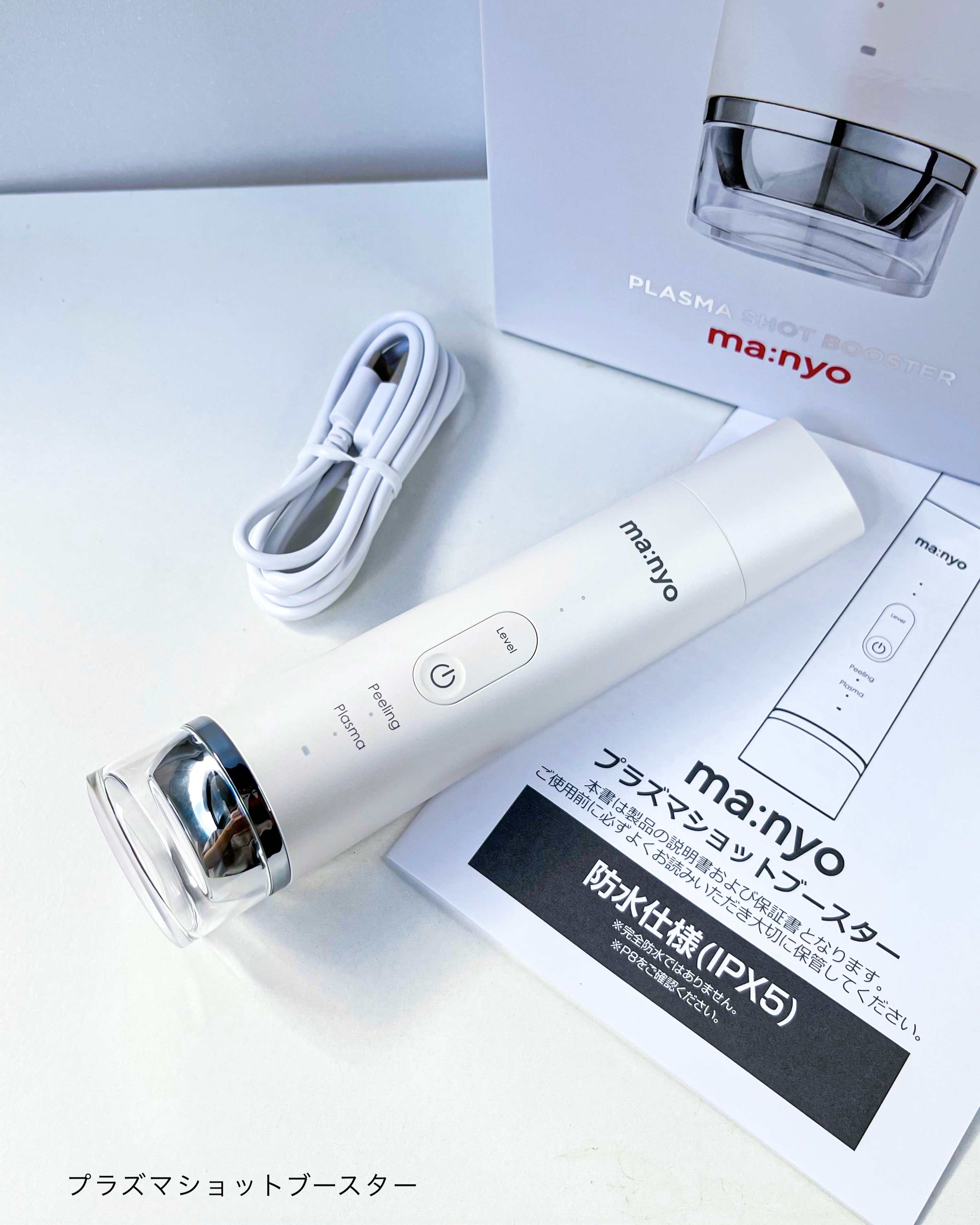 - ① イオン導入超えの600%浸透※1※2を誇る「低温プラズマ」 史上最高32,000回振動の※3「ウォーターピーリング」を採用。 ※1 同社製品CB054のイオン導入機器とプラズマモード使用時の比較。プラセンタ水溶液で浸透試験を実施。第3者機関調べ。 ※2 角質層まで ※3 メーカー従来品との比較 ■プラズマ照射とは プラズマはその圧倒的な浸透力から、美容業界やエステサロンでも注目されている最新技術です。 プラズマの電気刺激で肌に浸透しづらい高分子美容成分を届けることが出来ます。 先進技術「低温大気圧プラズマ」は、美容業界の分野で活用が進んでおり、注目されています。 ※角質層まで ②製品機能(モード別) 水光肌※1※2を叶えるためのma:nyoが選んだ2つの機能 ■PLASMAモード(低温プラズマ) プラズマ技術でスキンケア成分の浸透を促進。※3 電気刺激で美容成分を浸透しやすい肌状態に導き、内側からうるおい、ハリのある水光肌へ。※1※2 ■PEELINGモード(ウォーターピーリング) 毎秒32,000回の超音波振動で、通常の洗顔では落としきれない毛穴汚れや皮脂、古い角質を浮かし出し、取り除きます。※1 ニキビ予防※1※2にも効果的。 ※1 ピーリングによりお肌を洗浄すること ※2 スキンケア化粧品の併用によるもの ※3 角質層まで ③アタッチメント不要。1台で全身トータルケア フェイスライン、頬、首筋、デコルテなど、さまざまな箇所のケアが可能。 アタッチメントの切り替えや別モデルを購入する必要がありません。 ④防水機能IPX5 防水等級IPX5※の「防水機能」でお風呂でのケアが可能に。 洗顔、プラズマケア、スキンケアの習慣化がオススメです。 ※ 完全防水ではございません。浸水させないでください。 ⑤誰でも簡単に使えるシンプル機能 ワンタッチ簡単ボタン操作。毎日、たった数分で水光肌ケアが完了。※ ※ ピーリングによりお肌を洗浄すること※スキンケア化粧品の併用によるもの ⑤生活に溶け込むデザイン 洗面所やホームデザインに馴染む、洗練されたフォルムで心弾むホームケアを。 ⑥美顔器と一緒に使うことでホームスキンケアの浸透率アップ※ ※角質層まで 7月15日(火)より順次、全国のドン・キホーテ系列店舗※5およびAmazonにて先行発売いたします。 ※5 一部お取り扱いのない店舗もございます。