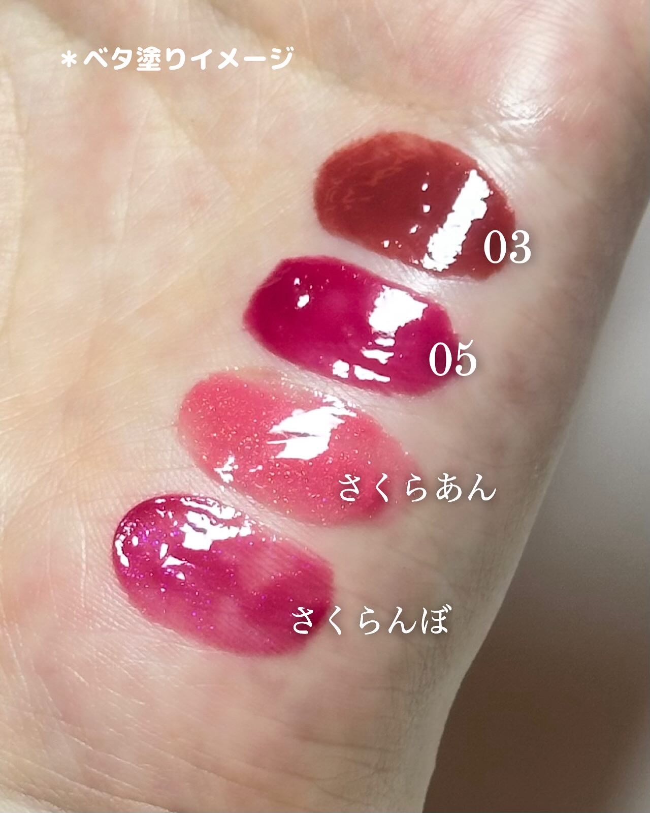 - <01 ジェントルピーチ> 水添ポリイソブテン、テトラ(ヒドロキシステアリン酸/イソステアリン酸)ジペンタエリスリチル、ヒドロキシステアリン酸エチルヘキシル、トリメリト酸トリトリデシル、水添ロジン酸メチル、ダイマージリノール酸(フィトステリル/イソステアリル/セチル/ステアリル/ベヘニル)、ジ安息香酸PG、合成ワックス、リンゴ酸ジイソステアリル、パラフィン、マカデミアナッツ脂肪酸フィトステリル、シリル化シリカ、イソステアリン酸ソルビタン、(VP/ヘキサデセン)コポリマー、酸化チタン、パルミチン酸デキストリン、マイクロクリスタリンワックス、トリイソステアリン酸ポリグリセリル-2、酸化鉄、赤202、黄5、ジイソステアリン酸ポリグリセリル-2、水、アルガニアスピノサ核油、ホホバ種子油、BG、サトウカエデエキス、フェノキシエタノール、アサイヤシ果実エキス、フラガリアチロエンシス果実エキス、クコ果実エキス、クロミグワ果実エキス、クロフサスグリ果実エキス、セイヨウヤブイチゴ果実エキス、キイチゴエキス、ローブッシュブルーベリー果実エキス、クランベリー果実エキス、ビルベリー果実エキス、エチルヘキシルグリセリン <02 アップルシナモン> 水添ポリイソブテン、テトラ(ヒドロキシステアリン酸/イソステアリン酸)ジペンタエリスリチル、ヒドロキシステアリン酸エチルヘキシル、トリメリト酸トリトリデシル、水添ロジン酸メチル、ダイマージリノール酸(フィトステリル/イソステアリル/セチル/ステアリル/ベヘニル)、ジ安息香酸PG、合成ワックス、パラフィン、リンゴ酸ジイソステアリル、マカデミアナッツ脂肪酸フィトステリル、シリル化シリカ、イソステアリン酸ソルビタン、(VP/ヘキサデセン)コポリマー、トリイソステアリン酸ポリグリセリル-2、パルミチン酸デキストリン、酸化鉄、マイクロクリスタリンワックス、酸化チタン、赤202、ジイソステアリン酸ポリグリセリル-2、黄5、水、アルガニアスピノサ核油、ホホバ種子油、BG、サトウカエデエキス、フェノキシエタノール、アサイヤシ果実エキス、フラガリアチロエンシス果実エキス、クコ果実エキス、クロミグワ果実エキス、クロフサスグリ果実エキス、セイヨウヤブイチゴ果実エキス、キイチゴエキス、ローブッシュブルーベリー果実エキス、クランベリー果実エキス、ビルベリー果実エキス、エチルヘキシルグリセリン <03 ローズミルクティー> 水添ポリイソブテン、テトラ(ヒドロキシステアリン酸/イソステアリン酸)ジペンタエリスリチル、ヒドロキシステアリン酸エチルヘキシル、トリメリト酸トリトリデシル、水添ロジン酸メチル、ダイマージリノール酸(フィトステリル/イソステアリル/セチル/ステアリル/ベヘニル)、ジ安息香酸PG、合成ワックス、リンゴ酸ジイソステアリル、パラフィン、マカデミアナッツ脂肪酸フィトステリル、シリル化シリカ、イソステアリン酸ソルビタン、(VP/ヘキサデセン)コポリマー、酸化チタン、トリイソステアリン酸ポリグリセリル-2、パルミチン酸デキストリン、マイクロクリスタリンワックス、酸化鉄、黄4、赤202、ジイソステアリン酸ポリグリセリル-2、青1、水、アルガニアスピノサ核油、ホホバ種子油、BG、サトウカエデエキス、フェノキシエタノール、アサイヤシ果実エキス、フラガリアチロエンシス果実エキス、クコ果実エキス、クロミグワ果実エキス、クロフサスグリ果実エキス、セイヨウヤブイチゴ果実エキス、キイチゴエキス、ローブッシュブルーベリー果実エキス、クランベリー果実エキス、ビルベリー果実エキス、エチルヘキシルグリセリン <04 ヌーディーフィグ> 水添ポリイソブテン、テトラ(ヒドロキシステアリン酸/イソステアリン酸)ジペンタエリスリチル、ヒドロキシステアリン酸エチルヘキシル、トリメリト酸トリトリデシル、水添ロジン酸メチル、ダイマージリノール酸(フィトステリル/イソステアリル/セチル/ステアリル/ベヘニル)、ジ安息香酸PG、合成ワックス、リンゴ酸ジイソステアリル、パラフィン、マカデミアナッツ脂肪酸フィトステリル、シリル化シリカ、イソステアリン酸ソルビタン、(VP/ヘキサデセン)コポリマー、酸化チタン、パルミチン酸デキストリン、マイクロクリスタリンワックス、トリイソステアリン酸ポリグリセリル-2、酸化鉄、黄4、赤202、ジイソステアリン酸ポリグリセリル-2、水、アルガニアスピノサ核油、ホホバ種子油、BG、サトウカエデエキス、フェノキシエタノール、アサイヤシ果実エキス、フラガリアチロエンシス果実エキス、クコ果実エキス、クロミグワ果実エキス、クロフサスグリ果実エキス、セイヨウヤブイチゴ果実エキス、キイチゴエキス、ローブッシュブルーベリー果実エキス、クランベリー果実エキス、ビルベリー果実エキス、エチルヘキシルグリセリン <05 シュガープラム> 水添ポリイソブテン、テトラ(ヒドロキシステアリン酸/イソステアリン酸)ジペンタエリスリチル、ヒドロキシステアリン酸