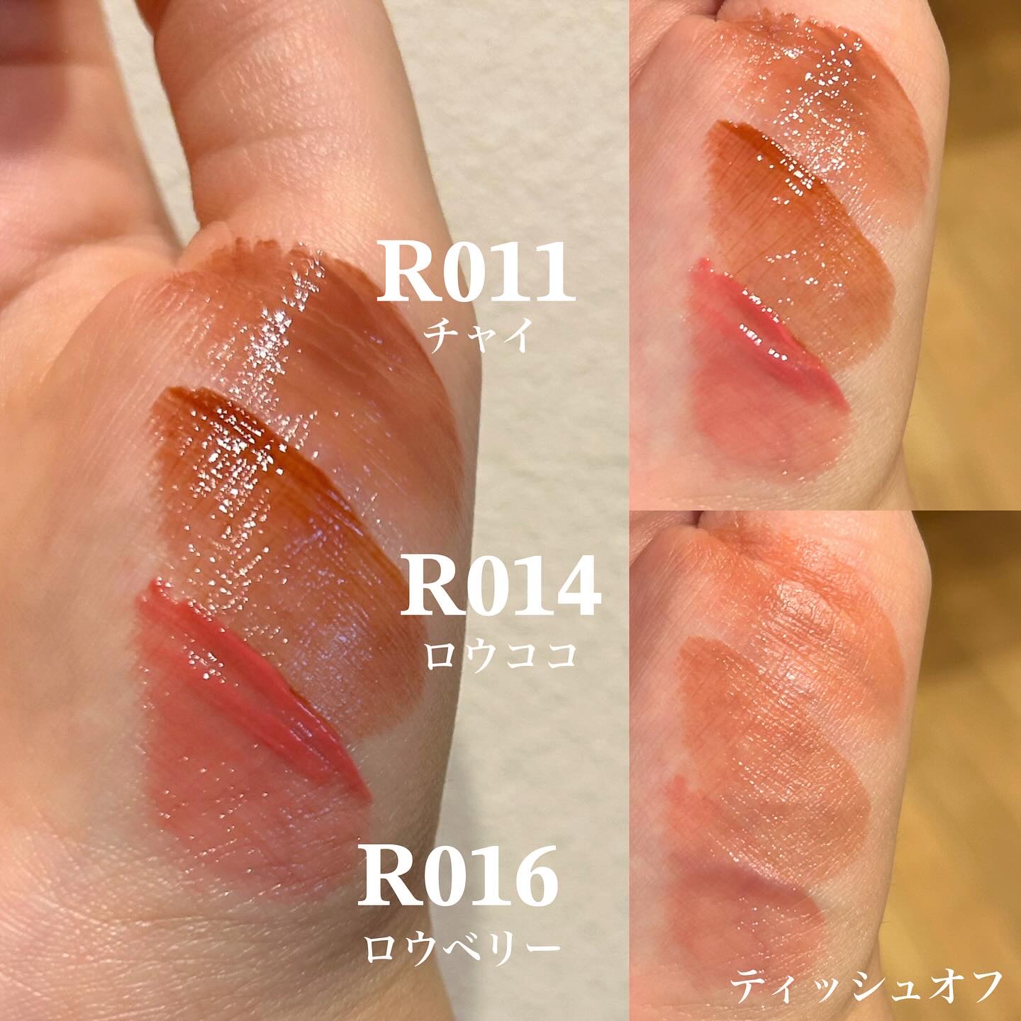 - <R001 ベア> 水、ジフェニルジメチコン、オクチルドデカノール、ビスジグリセリルポリアシルアジペート-2、リンゴ酸ジイソステアリル、トリメチルシロキシフェニルジメチコン、水添ポリイソブテン、ジグリセリン、ポリソルベート60、BG、セチルPEG/PPG-10/1ジメチコン、1,2-ヘキサンジオール、ペンチレングリコール、(アクリル酸ヒドロキシエチル/アクリロイルジメチルタウリンNa)コポリマー、セテアレス-20、スクワラン、フェノキシエタノール、酸化チタン、香料、エチルヘキシルグリセリン、黄5、赤227、イソステアリン酸ソルビタン、水酸化Al、ポリアクリル酸アンモニウム、酢酸トコフェロール、黄4、青1、ヒアルロン酸Na、(アルギニン/リシン)ポリペプチド、加水分解ヒアルロン酸、トコフェロール、アセチルヒアルロン酸Na、ソルビン酸 <R002 ロウローズ> 水、ジフェニルジメチコン、オクチルドデカノール、ビスジグリセリルポリアシルアジペート-2、リンゴ酸ジイソステアリル、トリメチルシロキシフェニルジメチコン、水添ポリイソブテン、ジグリセリン、ポリソルベート60、BG、セチルPEG/PPG-10/1ジメチコン、1,2-ヘキサンジオール、ペンチレングリコール、(アクリル酸ヒドロキシエチル/アクリロイルジメチルタウリンNa)コポリマー、セテアレス-20、スクワラン、フェノキシエタノール、酸化チタン、香料、エチルヘキシルグリセリン、黄5、赤227、イソステアリン酸ソルビタン、酢酸トコフェロール、水酸化Al、ポリアクリル酸アンモニウム、ヒアルロン酸Na、青1、加水分解ヒアルロン酸、(アルギニン/リシン)ポリペプチド、トコフェロール、アセチルヒアルロン酸Na、ソルビン酸 <R003 ロウプリコット> 水、ジフェニルジメチコン、オクチルドデカノール、ビスジグリセリルポリアシルアジペート-2、リンゴ酸ジイソステアリル、トリメチルシロキシフェニルジメチコン、水添ポリイソブテン、ジグリセリン、ポリソルベート60、BG、セチルPEG/PPG-10/1ジメチコン、1,2-ヘキサンジオール、ペンチレングリコール、(アクリル酸ヒドロキシエチル/アクリロイルジメチルタウリンNa)コポリマー、セテアレス-20、スクワラン、フェノキシエタノール、香料、エチルヘキシルグリセリン、酸化チタン、黄5、イソステアリン酸ソルビタン、赤227、酢酸トコフェロール、ヒアルロン酸Na、水酸化Al、ポリアクリル酸アンモニウム、加水分解ヒアルロン酸、青1、(アルギニン/リシン)ポリペプチド、トコフェロール、アセチルヒアルロン酸Na、ソルビン酸 <R004 フィーバー> 水、ジフェニルジメチコン、オクチルドデカノール、リンゴ酸ジイソステアリル、ビスジグリセリルポリアシルアジペート-2、トリメチルシロキシフェニルジメチコン、水添ポリイソブテン、ジグリセリン、ポリソルベート60、BG、セチルPEG/PPG-10/1ジメチコン、1,2-ヘキサンジオール、ペンチレングリコール、(アクリル酸ヒドロキシエチル/アクリロイルジメチルタウリンNa)コポリマー、セテアレス-20、スクワラン、フェノキシエタノール、香料、エチルヘキシルグリセリン、黄5、赤227、イソステアリン酸ソルビタン、酢酸トコフェロール、ヒアルロン酸Na、加水分解ヒアルロン酸、(アルギニン/リシン)ポリペプチド、トコフェロール、アセチルヒアルロン酸Na、ソルビン酸 <R005 ハイビスカス> 水、ジフェニルジメチコン、オクチルドデカノール、ビスジグリセリルポリアシルアジペート-2、リンゴ酸ジイソステアリル、トリメチルシロキシフェニルジメチコン、水添ポリイソブテン、ジグリセリン、ポリソルベート60、BG、セチルPEG/PPG-10/1ジメチコン、1,2-ヘキサンジオール、ペンチレングリコール、アクリル酸ヒドロキシエチル/アクリロイルジメチルタウリンNa)コポリマー、セテアレス-20、スクワラン、フェノキシエタノール、香料、エチルヘキシルグリセリン、赤227、黄5、イソステアリン酸ソルビタン、赤104(1)、酢酸トコフェロール、ヒアルロン酸Na、加水分解ヒアルロン酸、(アルギニン/リシン)ポリペプチド、トコフェロール、アセチルヒアルロン酸Na、ソルビン酸 <R006 ロウグレープ> 水、ジフェニルジメチコン、ビスジグリセリルポリアシルアジペート-2、リンゴ酸ジイソステアリル、オクチルドデカノール、トリメチルシロキシフェニルジメチコン、水添ポリイソブテン、ジグリセリン、ポリソルベート60、BG、セチルPEG/PPG-10/1ジメチコン、1,2-ヘキサンジオール、ペンチレングリコール、(アクリル酸ヒドロキシエチル/アクリロイルジメチルタウリンNa)コポリマー、セテアレス-20、スクワラン、酸化チタン、フェノキシエタノール、香料、エチルヘキシルグリセリン、黄5、赤227、イソステアリン酸ソルビタン、水酸化Al、ポリアクリル酸アンモニウム、酢酸トコフェロール、ヒアルロン酸Na、青1、加水分解ヒアルロン酸、(アルギニン/リシン)ポリペプチド、トコフェロール、アセチルヒアルロン酸Na、ソルビン酸 <R007 チル> 水、ジフェニルジメチコン、オクチルドデカノール、ビスジ