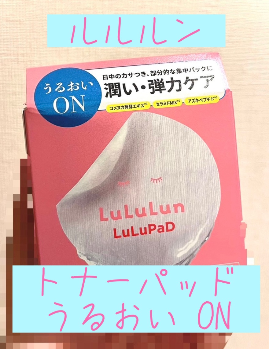 - <ルルルン トナーパッド うるおいON> 水、BG、グリセリン、キサンタンガム、フェノキシエタノール、メチルパラベン、香料、セラミドNG、水添レシチン、クエン酸、セラミドNP、PEG-60水添ヒマシ油、セラミドAP、セラミドEOP、ミリスチン酸ポリグリセリル-10、フィトステロールズ、クエン酸Na、レブリン酸、レブリン酸Na、セラミドAG、サッカロミセス/コメヌカ発酵液エキス、アズキ種子エキス、レウコノストック/ダイコン根発酵液