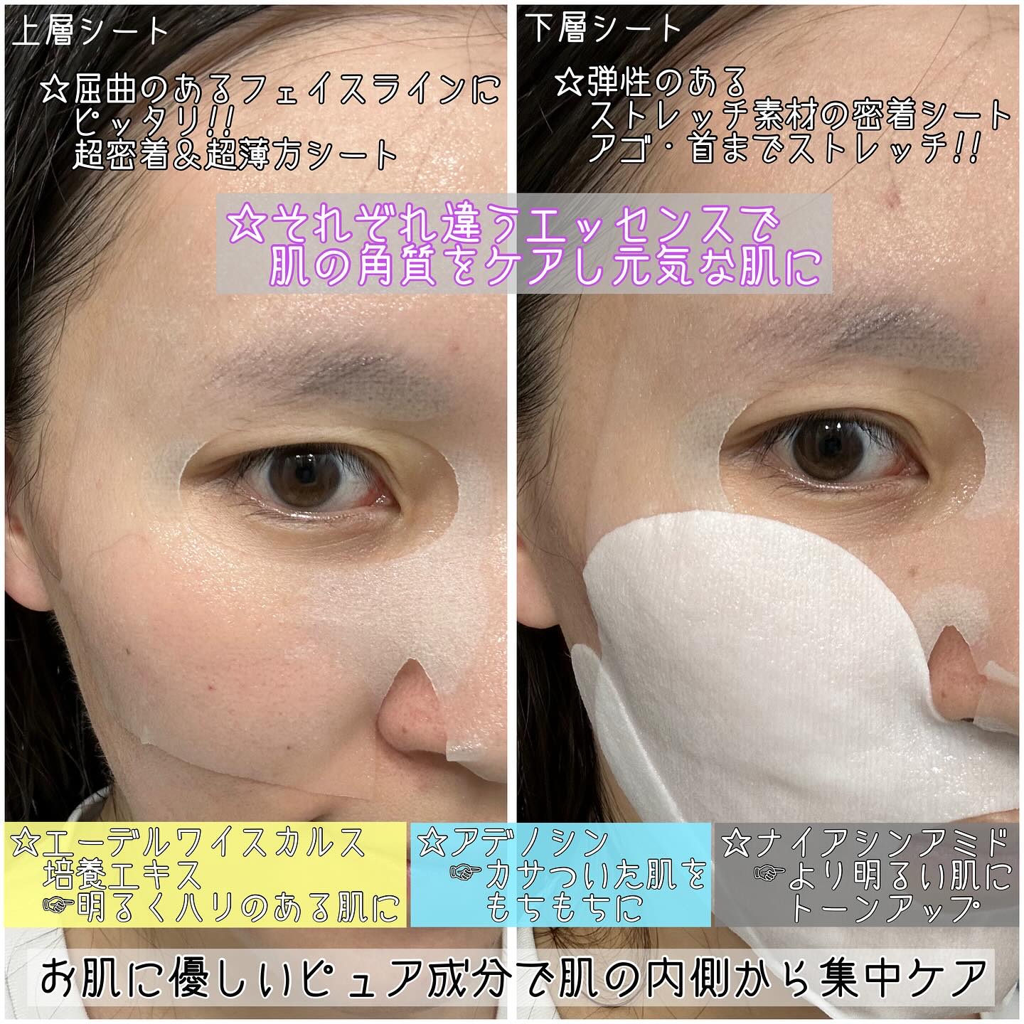 - 週に一度のご褒美ケアマスク!アンプルシート、上層シート、下層シートの3ステップ。 エーデルワイスカルス培養エキス(*1)が古い角質をケアし、ツルスベ肌に。 上下に分かれたシートがピタッと密着し、キメの整ったもっちり美肌に導きます。 *1整肌成分