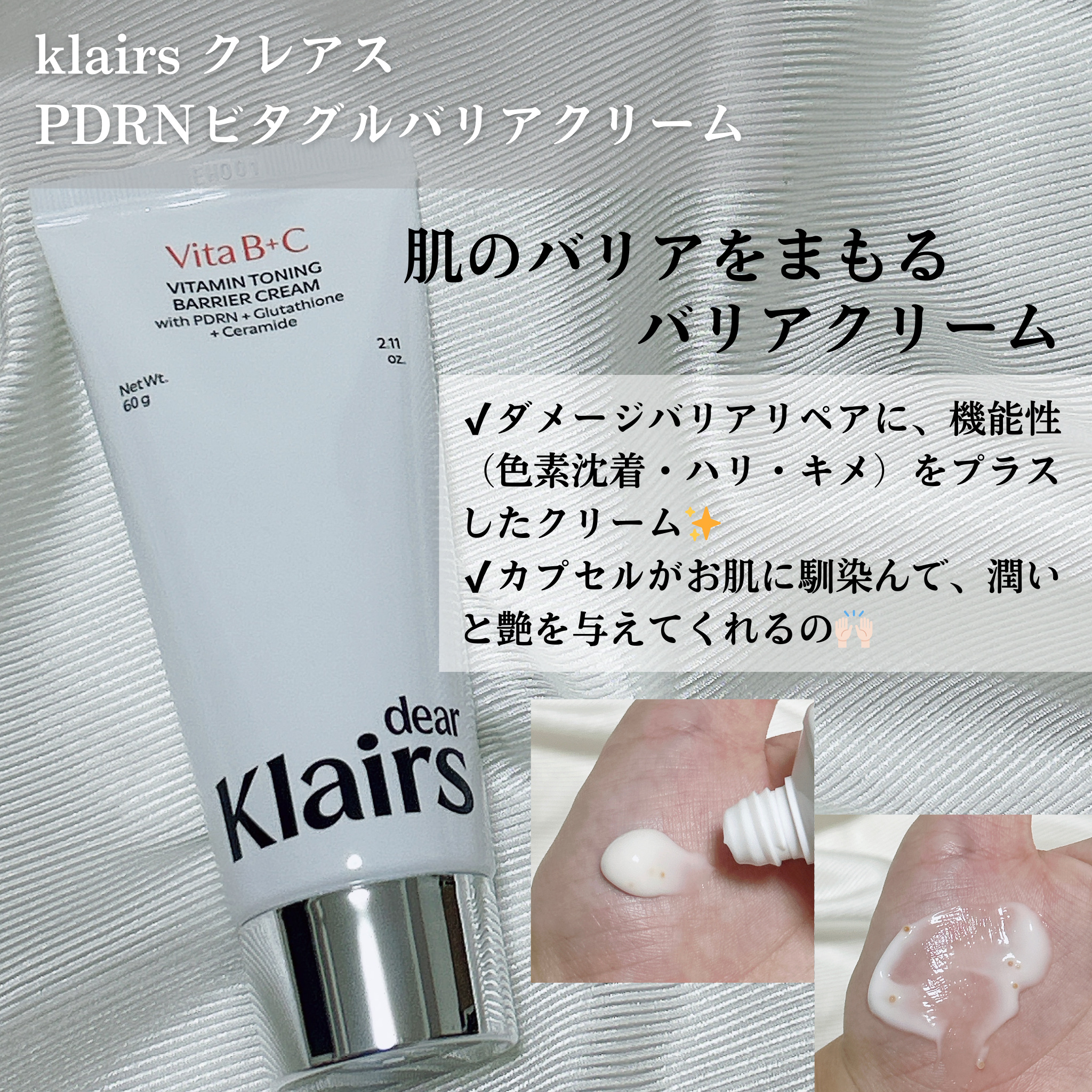 .敏感肌でも使える!ビタミンカプセル入りのバリアクリーム♡〈商品〉klairsPDRNビタグルバリアクリームダメージバリアリペアに機能性(色素沈着・ハリ・キメ)をプラスしたクリーム。吸収と効果を最大化したカプセル処方クリームで、ビタミンカプセ...