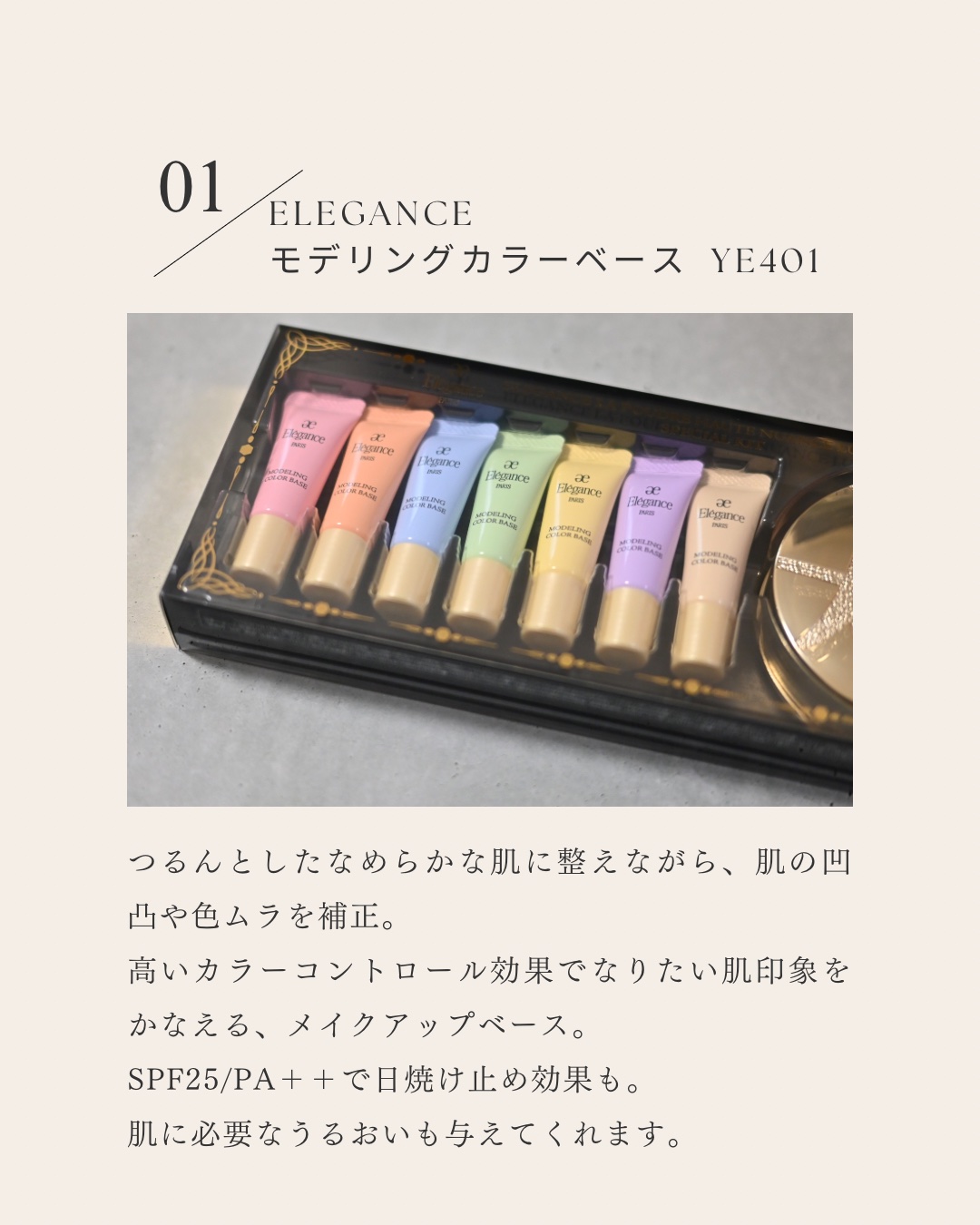 - SPF25 PA++ なりたい印象へ自在に肌色補正。 多彩な7色のメイクアップベース ■抜群のコントロール効果で自在に肌色チェンジ 肌色そのものが変化したかのようなカラーコントロール効果で、色ムラを自然にカバーしながら、明るく澄んだトーンに。 自在に色を仕込み、肌色を補正して、なりたい肌印象へ導きます。 ■キメや毛穴をカバーしつるんとなめらかに みずみずしいベースが肌の毛穴や凹凸を自然にカバー。 透明感のあるキメ細かくつるんとした肌に整えます。 ■うるおった艶やかな肌と圧倒的※なラスティング 透明度の高いオイルやエモリエント成分を配合。 乾燥から肌を守りながら、しっとりうるおうツヤ肌へ導きます。 肌とベースメイクをつなぎとめるベース構造により、色くすみを防ぎながら、美しい仕上がりが持続します。 ※エレガンスにおいて