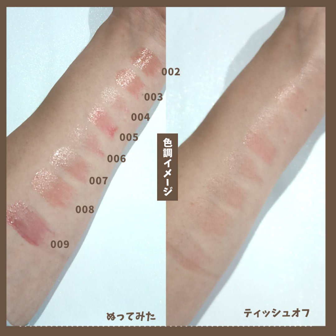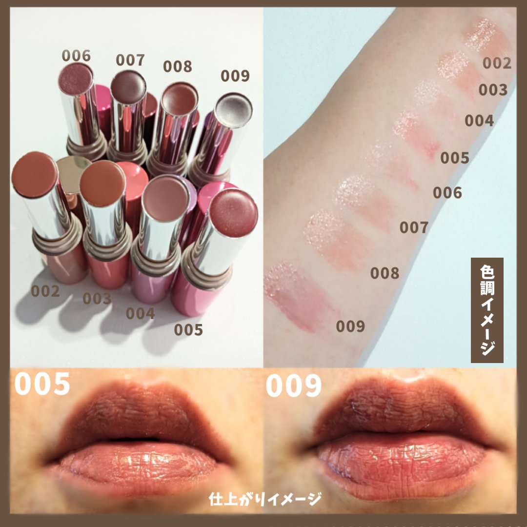 - うるんだツヤで、ぷっくり*唇 クリアな発色で、うるおい色づく口元に 1.輝きあふれるようなツヤ 輝きがあふれるような、濃密なツヤ感がつづく 2. 立体的な、ぷっくり感* うるおいツヤやかで立体的な、ぷっくり感*のある唇を演出。 3.シアーでクリアな発色 透け感があり、重ねることで、より鮮やかな発色に 4.うるおい感で、唇をなめらかに とろけるように密着して、ぷっくり*とした滑らかな唇に。 *乳酸メチル(整肌成分)の冷感、保湿成分(ツバキ種子油、ヒマワリ種子油、アーモンド油、マカデミア種子油、ヒマシ油)によるメイクアップ効果