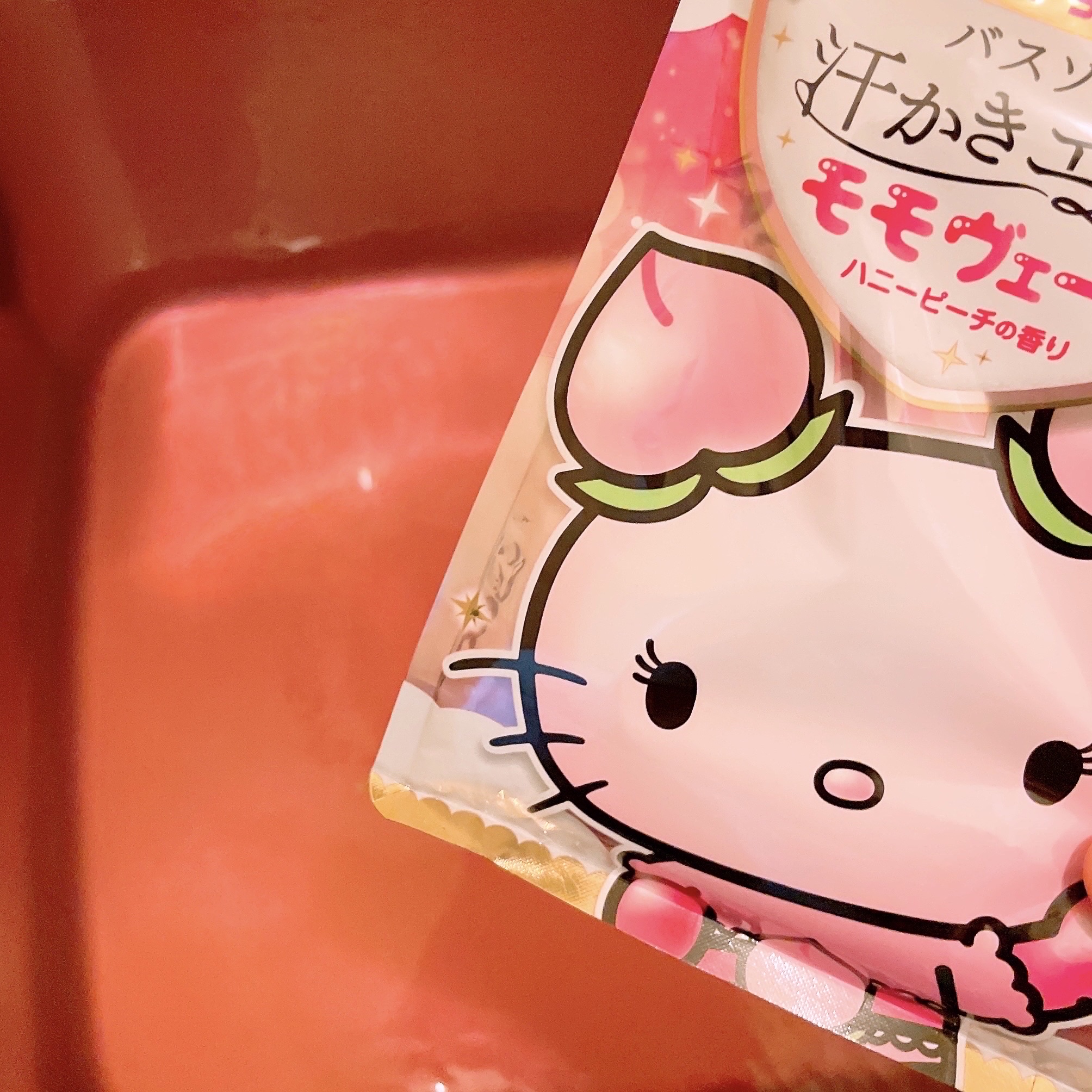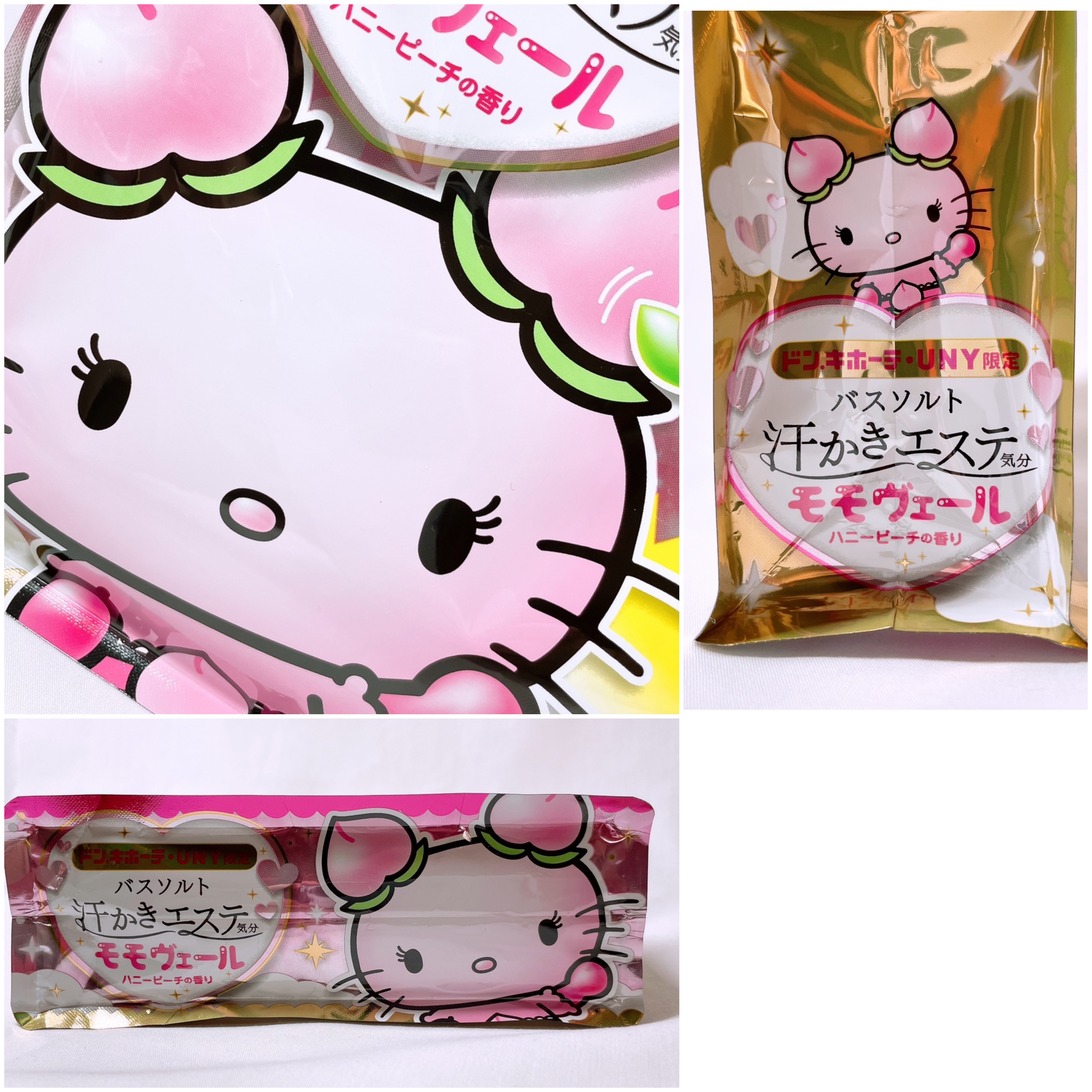 𓈒𓏸✾𓏸𓈒汗かきエステ気分 モモヴェールドン・キホーテ、UNY限定!じんわり汗かき、お肌はつるつるスベスベミネラルを含んだバスソルトが美肌に導いてくれるそうですパケはセクシー秘書「ハニーモモ」というキティちゃんのレアキャラのパッケージ袋を開け...