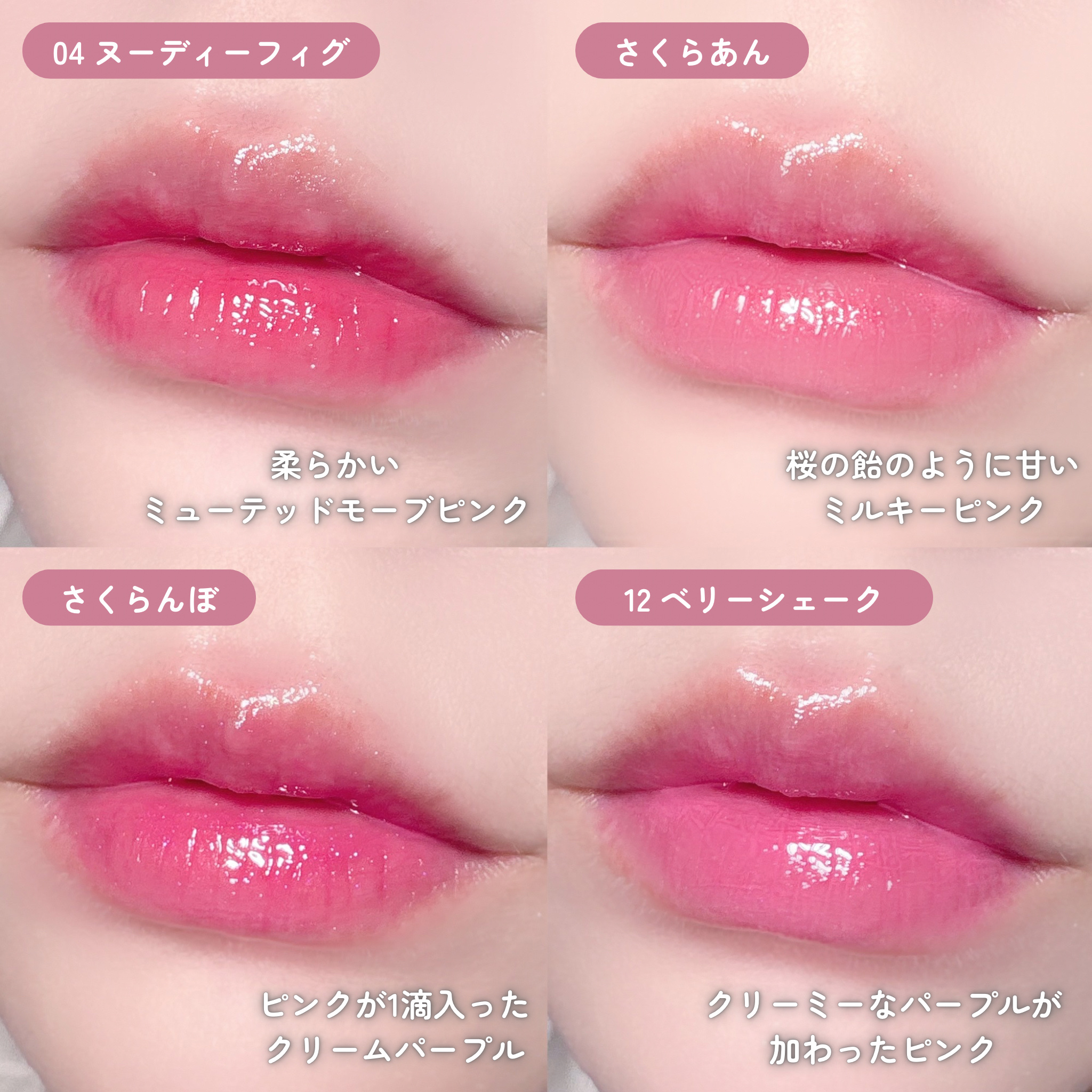 - <01 ジェントルピーチ> 水添ポリイソブテン、テトラ(ヒドロキシステアリン酸/イソステアリン酸)ジペンタエリスリチル、ヒドロキシステアリン酸エチルヘキシル、トリメリト酸トリトリデシル、水添ロジン酸メチル、ダイマージリノール酸(フィトステリル/イソステアリル/セチル/ステアリル/ベヘニル)、ジ安息香酸PG、合成ワックス、リンゴ酸ジイソステアリル、パラフィン、マカデミアナッツ脂肪酸フィトステリル、シリル化シリカ、イソステアリン酸ソルビタン、(VP/ヘキサデセン)コポリマー、酸化チタン、パルミチン酸デキストリン、マイクロクリスタリンワックス、トリイソステアリン酸ポリグリセリル-2、酸化鉄、赤202、黄5、ジイソステアリン酸ポリグリセリル-2、水、アルガニアスピノサ核油、ホホバ種子油、BG、サトウカエデエキス、フェノキシエタノール、アサイヤシ果実エキス、フラガリアチロエンシス果実エキス、クコ果実エキス、クロミグワ果実エキス、クロフサスグリ果実エキス、セイヨウヤブイチゴ果実エキス、キイチゴエキス、ローブッシュブルーベリー果実エキス、クランベリー果実エキス、ビルベリー果実エキス、エチルヘキシルグリセリン <02 アップルシナモン> 水添ポリイソブテン、テトラ(ヒドロキシステアリン酸/イソステアリン酸)ジペンタエリスリチル、ヒドロキシステアリン酸エチルヘキシル、トリメリト酸トリトリデシル、水添ロジン酸メチル、ダイマージリノール酸(フィトステリル/イソステアリル/セチル/ステアリル/ベヘニル)、ジ安息香酸PG、合成ワックス、パラフィン、リンゴ酸ジイソステアリル、マカデミアナッツ脂肪酸フィトステリル、シリル化シリカ、イソステアリン酸ソルビタン、(VP/ヘキサデセン)コポリマー、トリイソステアリン酸ポリグリセリル-2、パルミチン酸デキストリン、酸化鉄、マイクロクリスタリンワックス、酸化チタン、赤202、ジイソステアリン酸ポリグリセリル-2、黄5、水、アルガニアスピノサ核油、ホホバ種子油、BG、サトウカエデエキス、フェノキシエタノール、アサイヤシ果実エキス、フラガリアチロエンシス果実エキス、クコ果実エキス、クロミグワ果実エキス、クロフサスグリ果実エキス、セイヨウヤブイチゴ果実エキス、キイチゴエキス、ローブッシュブルーベリー果実エキス、クランベリー果実エキス、ビルベリー果実エキス、エチルヘキシルグリセリン <03 ローズミルクティー> 水添ポリイソブテン、テトラ(ヒドロキシステアリン酸/イソステアリン酸)ジペンタエリスリチル、ヒドロキシステアリン酸エチルヘキシル、トリメリト酸トリトリデシル、水添ロジン酸メチル、ダイマージリノール酸(フィトステリル/イソステアリル/セチル/ステアリル/ベヘニル)、ジ安息香酸PG、合成ワックス、リンゴ酸ジイソステアリル、パラフィン、マカデミアナッツ脂肪酸フィトステリル、シリル化シリカ、イソステアリン酸ソルビタン、(VP/ヘキサデセン)コポリマー、酸化チタン、トリイソステアリン酸ポリグリセリル-2、パルミチン酸デキストリン、マイクロクリスタリンワックス、酸化鉄、黄4、赤202、ジイソステアリン酸ポリグリセリル-2、青1、水、アルガニアスピノサ核油、ホホバ種子油、BG、サトウカエデエキス、フェノキシエタノール、アサイヤシ果実エキス、フラガリアチロエンシス果実エキス、クコ果実エキス、クロミグワ果実エキス、クロフサスグリ果実エキス、セイヨウヤブイチゴ果実エキス、キイチゴエキス、ローブッシュブルーベリー果実エキス、クランベリー果実エキス、ビルベリー果実エキス、エチルヘキシルグリセリン <04 ヌーディーフィグ> 水添ポリイソブテン、テトラ(ヒドロキシステアリン酸/イソステアリン酸)ジペンタエリスリチル、ヒドロキシステアリン酸エチルヘキシル、トリメリト酸トリトリデシル、水添ロジン酸メチル、ダイマージリノール酸(フィトステリル/イソステアリル/セチル/ステアリル/ベヘニル)、ジ安息香酸PG、合成ワックス、リンゴ酸ジイソステアリル、パラフィン、マカデミアナッツ脂肪酸フィトステリル、シリル化シリカ、イソステアリン酸ソルビタン、(VP/ヘキサデセン)コポリマー、酸化チタン、パルミチン酸デキストリン、マイクロクリスタリンワックス、トリイソステアリン酸ポリグリセリル-2、酸化鉄、黄4、赤202、ジイソステアリン酸ポリグリセリル-2、水、アルガニアスピノサ核油、ホホバ種子油、BG、サトウカエデエキス、フェノキシエタノール、アサイヤシ果実エキス、フラガリアチロエンシス果実エキス、クコ果実エキス、クロミグワ果実エキス、クロフサスグリ果実エキス、セイヨウヤブイチゴ果実エキス、キイチゴエキス、ローブッシュブルーベリー果実エキス、クランベリー果実エキス、ビルベリー果実エキス、エチルヘキシルグリセリン <05 シュガープラム> 水添ポリイソブテン、テトラ(ヒドロキシステアリン酸/イソステアリン酸)ジペンタエリスリチル、ヒドロキシステアリン酸