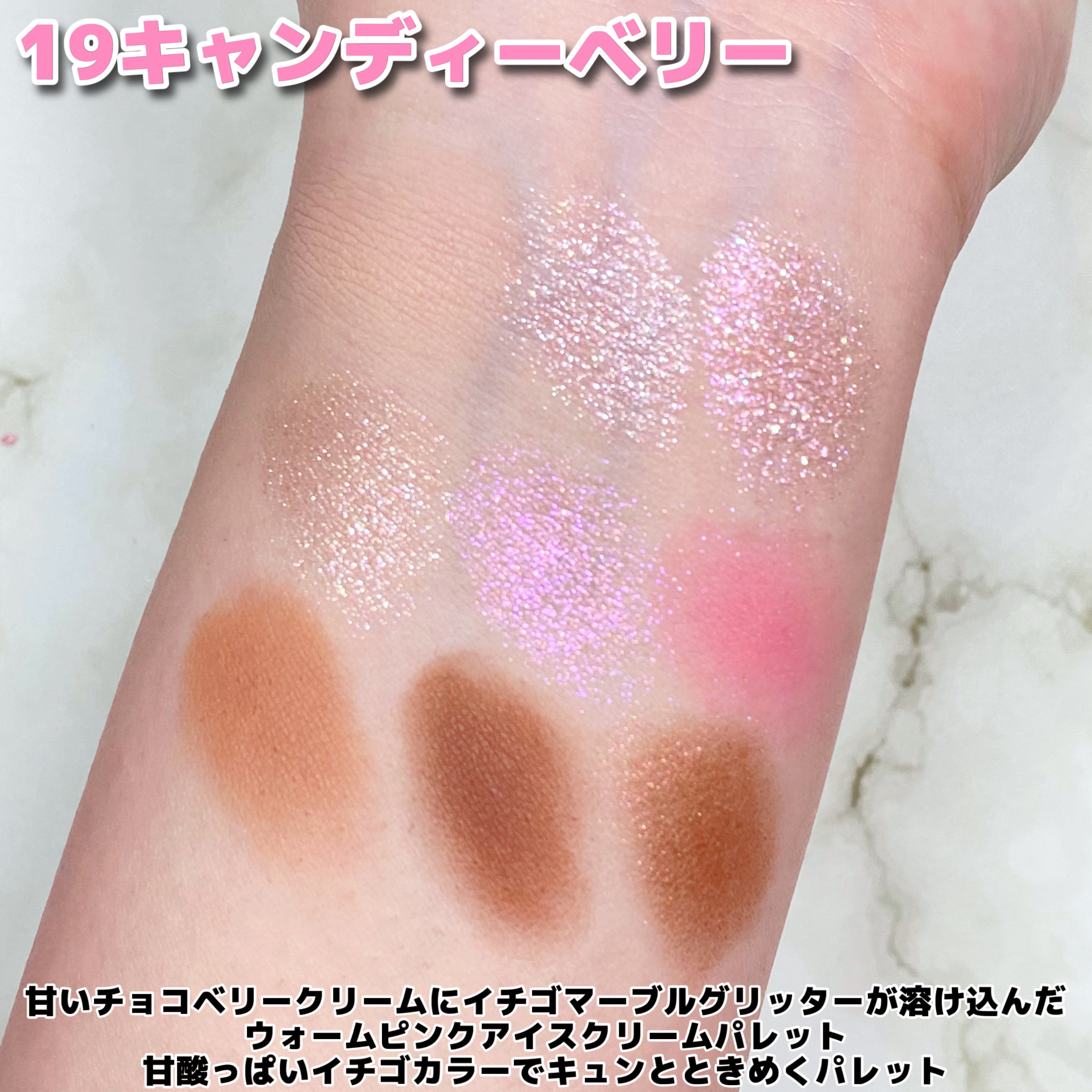 甘いチョコベリークリームにイチゴマーブルグリッターが溶け込んだウォームピンクアイスクリームパレット 天然色素を使用して粉飛びが少なく、瞼にピタッと密着 動物性原料排除・動物実験を行っていない正式VEGAN(ヴィーガン)認証済み