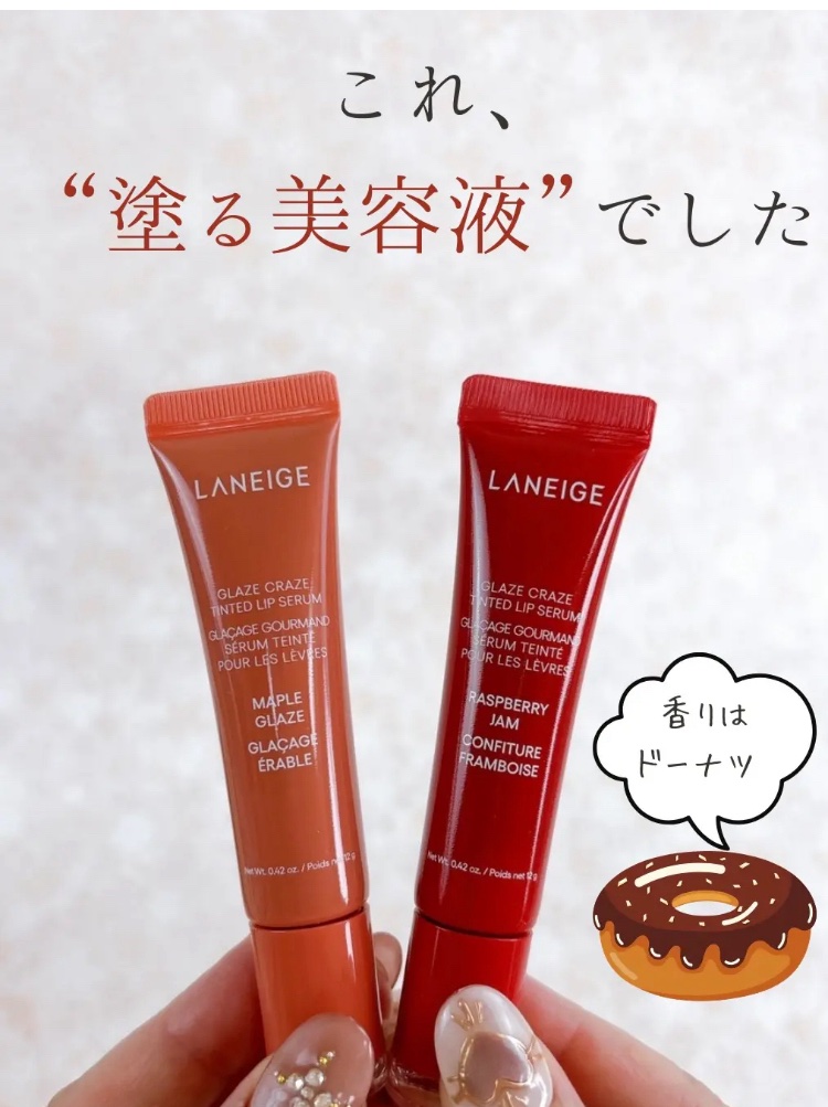 - 思わず食べたくなるドーナツの香り広がる「♯ドーナツリップ」 ひと塗りでぷるんとツヤめく、とろけるような唇へ。 全世界で2秒に1個売れている*1「リップスリーピングマスク」でおなじみのラネージュから、新作リップケアアイテムが登場! 1.95%スキンケア成分配合で、唇にうるおいをチャージ 「グレイズ ティントリップセラム」は、整肌成分「ダイズポリペプチド、ザクロ種子油」と保湿成分「セラミドNP、ポリグルタミン酸」などの95%スキンケア成分を配合。濃密な保湿力が、乾燥による唇の荒れを防ぎ、ふっくらとした潤いある唇へと導きます。 2.重ねるたびに鮮やかに輝く。ぷるんと弾むボリューミー*²な仕上がり なめらかでべたつかず、快適に塗布できるテクスチャー。シアーな発色が唇にナチュラルな血色感をプラスし、重ねるほどに深みと鮮やかさを引き立てます。みずみずしくふっくらと艶やかな仕上がりで、どんなシーンやムードにもマッチする、あなただけのリップルックをお楽しみいただけます。 3.ひと塗りでムラなくフィットするドーナツ型アプリケーション クッション性のある可愛らしいドーナツ型アプリケーターが、唇にスムーズにフィット。ひと塗りでムラなく美しい仕上がりを叶え、オーバーリップとレイヤングが思いのまま。思わず手に取りたくなるような甘いドーナツの香りとともにあなただけのユニークなリップスタイルを演出します。 *¹ グローバル販売実績 *² メイクアップ効果による 発売日:2025年3月1日オンラインショップにて先行発売、4月19日以降、各チャネルで順次発売 ※お取り扱いは店舗により異なります。一部店舗のみの取り扱いとなります。