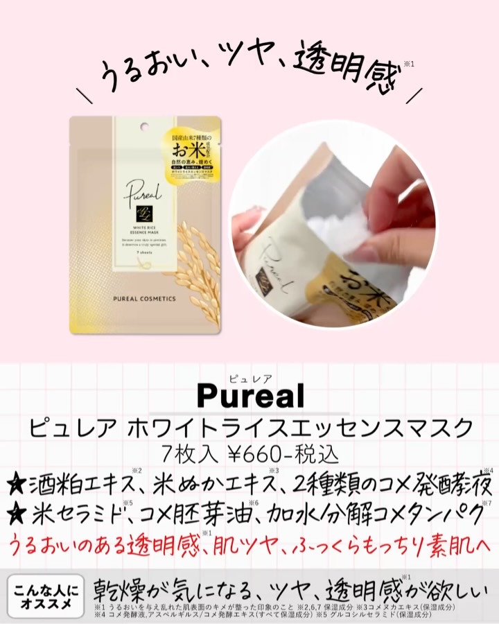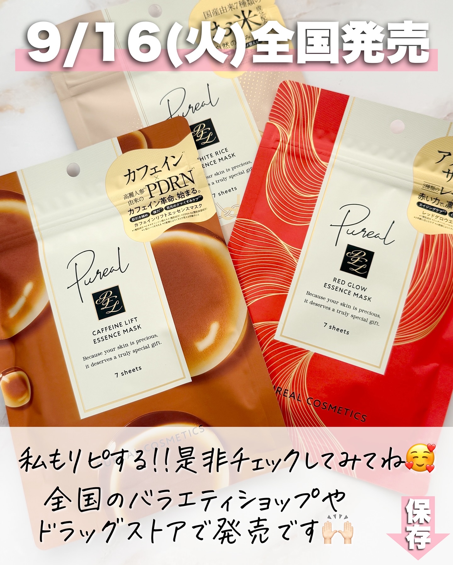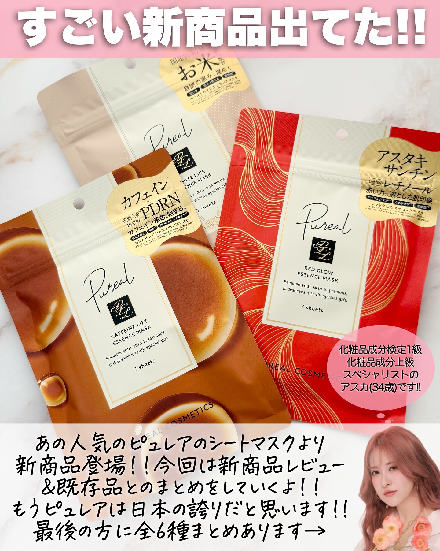 ピュレアさんから「ホワイトライスエッセンスマスク」「カフェインリフトエッセンスマスク」をいただきました。♡あのピュレアからシートマスクが新登場!♡こだわりの成分配合で低刺激処方。肌に優しい使い心地♡なめらかさUP高密着シート★カフェインリフト...