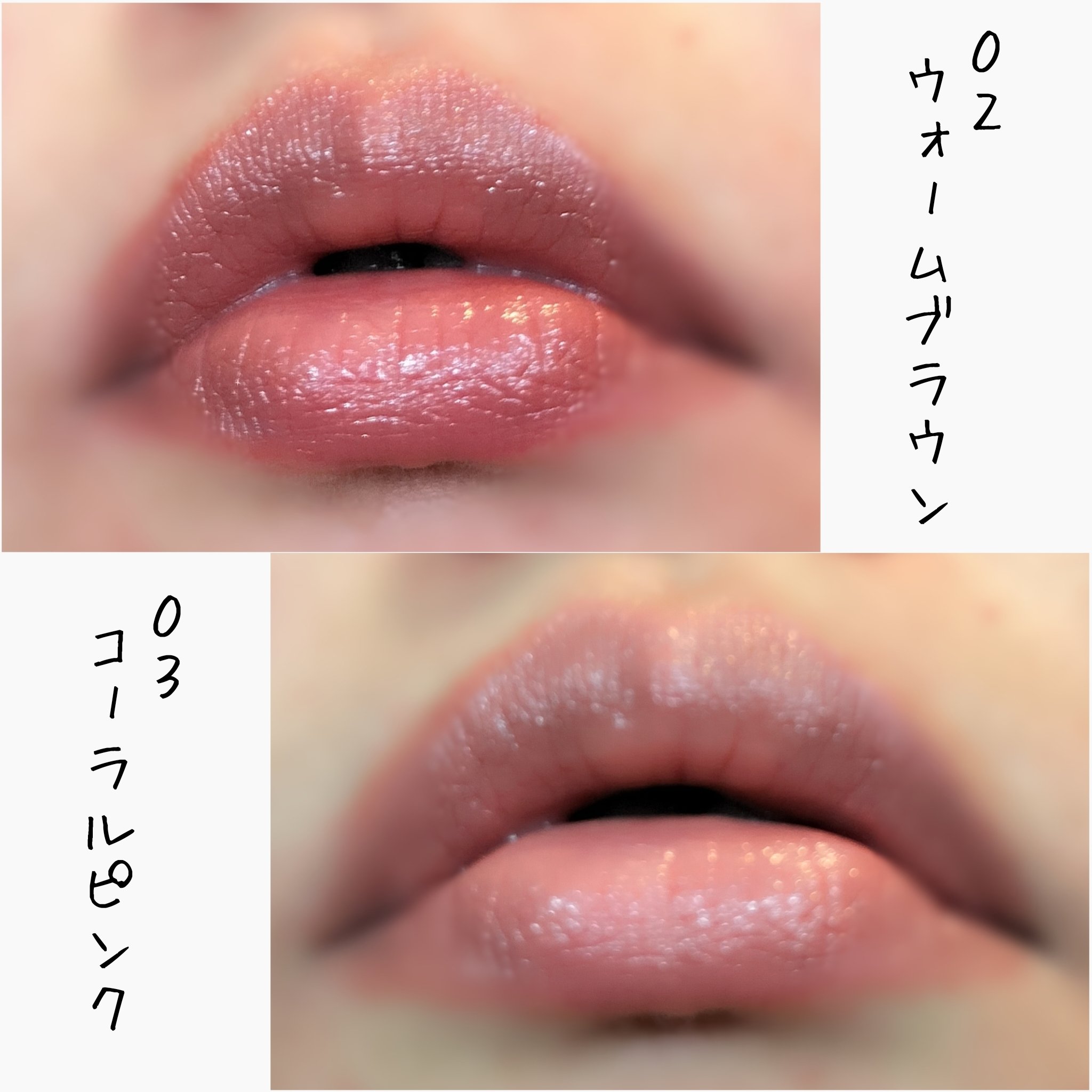 クリスタルプラムはゴールドラメがチラチラ輝いて綺麗。 思ったよりも使いやすい色味。明る過ぎないし、暗過ぎない、落ち着いた色。秋から冬に使いたい色。 オーロラピンクはピンクとブルーのラメがチラチラと輝いて綺麗。 塗れば塗るほど唇が白っぽくなる。ニュアンスチェンジにピッタリ。 日常使いしやすいのは圧倒的にクリスタルプラム。 最後の一本だったのも納得。香りは良いし、保湿力は高いし、スースー感が心地良いので買ってよかった。